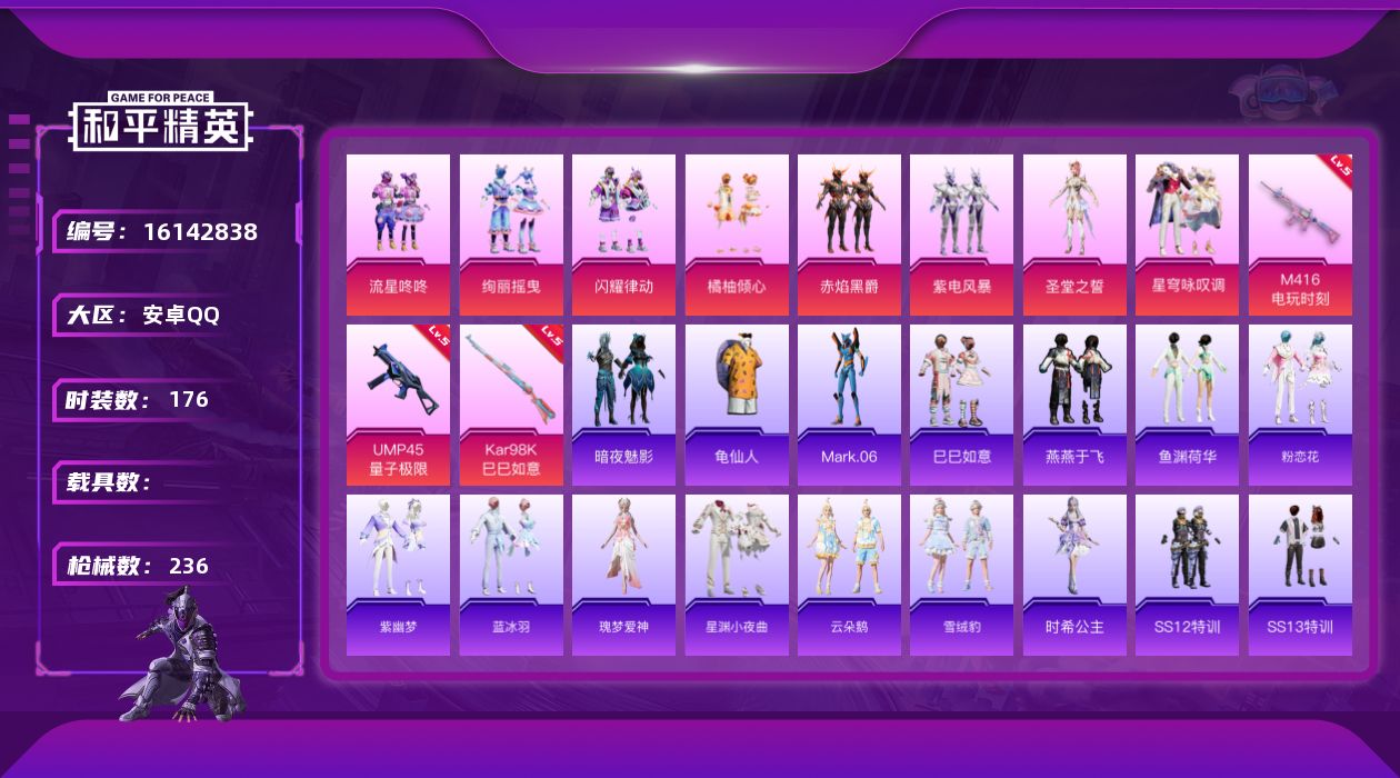 [16142838]【特价出售/店主推荐】 地铁满天赋 安卓 手Q-8粉装-3特效枪-0载具-1粉色飞行器-72303热力值-11王牌印记-176套装-236枪皮【热门品类】:套装-龟仙人,角色-Mark.06【粉色套装】:粉装-流星咚咚,粉装-绚丽摇曳,粉装-闪耀律动,粉装-橘柚倾心,粉装-赤焰黑爵,粉装-紫电风暴,角色-圣堂之誓,粉装-星穹咏叹调【粉色枪皮等级】:M416-电玩时刻(五级),UMP45-量子极限(五级),Kar98K-巳巳如意(五级)【粉色枪皮】:M416-电玩时刻,UMP45-量子极限,Kar98K-巳巳如意【粉色飞行器】:星之彼岸飞行器