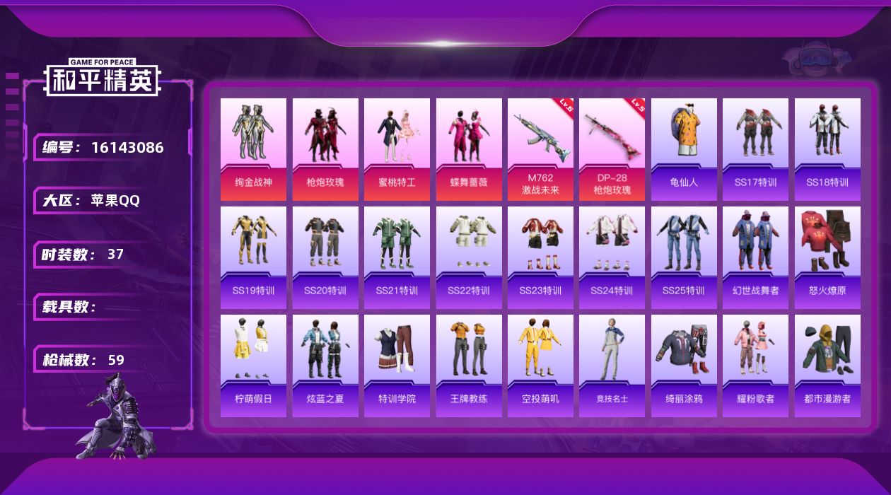 [16143086]【店主推荐捡漏号!可直接换绑】苹果 手Q-4粉装-2特效枪-0载具-0粉色飞行器-18260热力值-2王牌印记-37套装-59枪皮【热门品类】:套装-龟仙人【粉色套装】:粉装-绚金战神,粉装-枪炮玫瑰,粉装-蜜桃特工,粉装-蝶舞蔷薇【粉色枪皮等级】:M762-激战未来(六级),DP-28-枪炮玫瑰(五级)【粉色枪皮】:M762-激战未来,DP-28-枪炮玫瑰