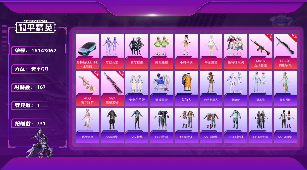 [16143067]【店主推荐捡漏号!可直接换绑】安卓 手Q-6粉装-4特效枪-1载具-1僚机-1粉色飞行器-73004热力值-10王牌印记-167套装-231枪皮【热门品类】:粉装-梦幻火箭,套装-浪漫天命,套装-龟仙人,角色-六号稻草人【粉色套装】:粉装-梦幻火箭,粉装-暗夜玫瑰,粉装-恐龙拽拽,角色-小可学妹,角色-千金淑猫,粉装-星穹咏叹调【粉色枪皮等级】:M416-五爪金龙(七级),AUG-暖羊咩咩(五级),M24-暗星紫秘(五级),DP-28-豹影疾电(五级)【粉色载具】:路特斯ELETRE(冰川蓝),僚机-萌兔起飞【粉色枪皮】:M416-五爪金龙,AUG-暖羊咩咩,M24-暗星紫秘,DP-28-豹影疾电【粉色飞行器】:鸢尾晶梦飞行器