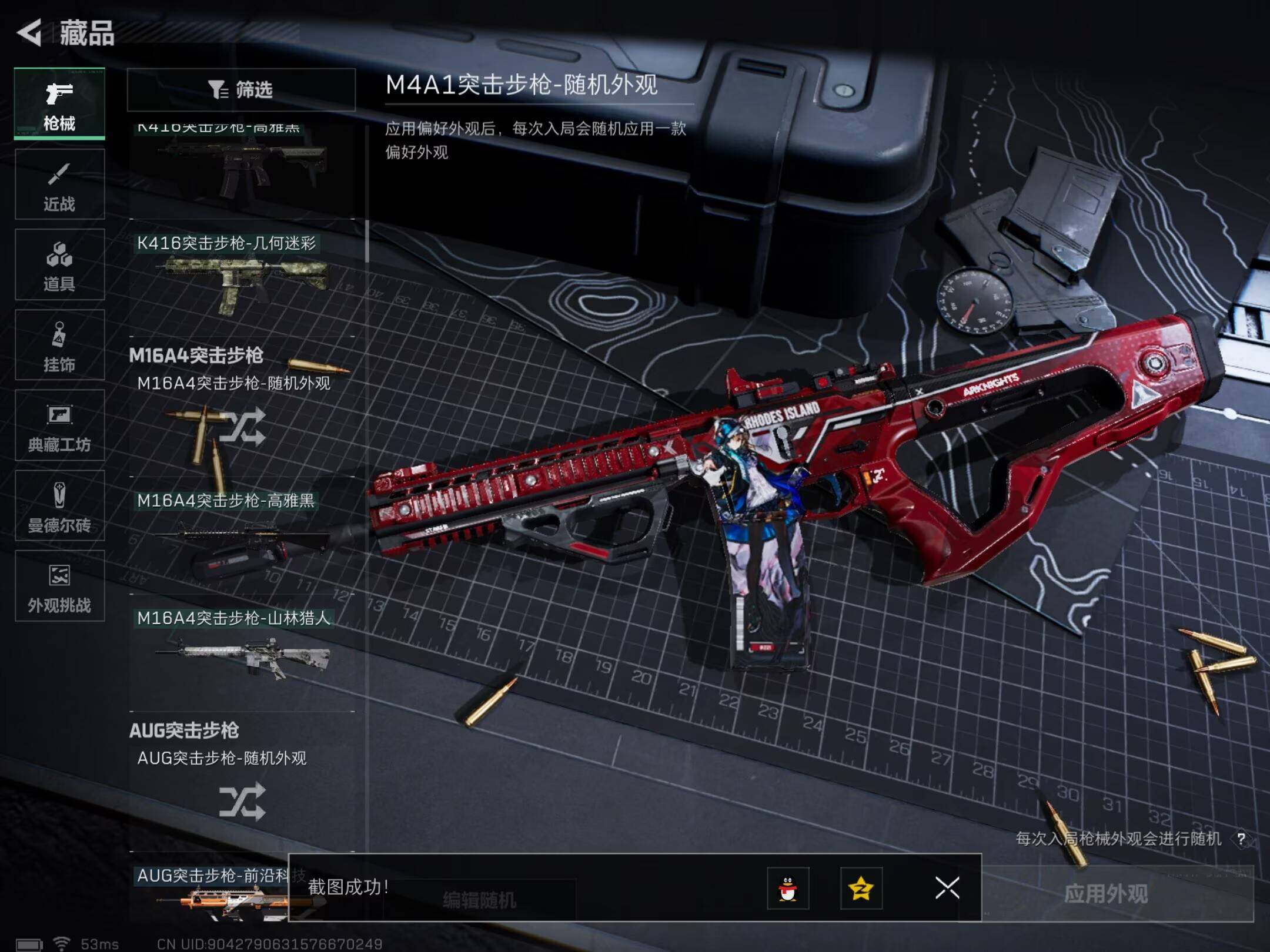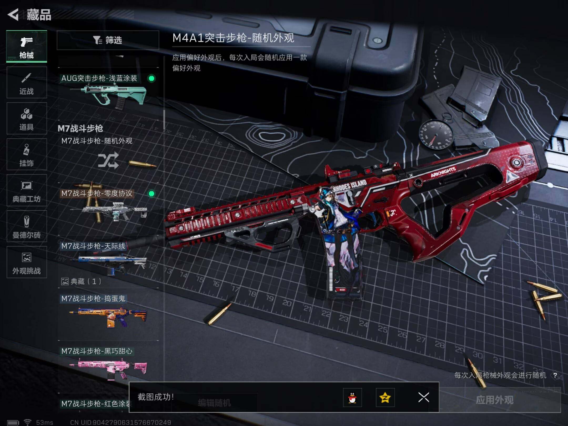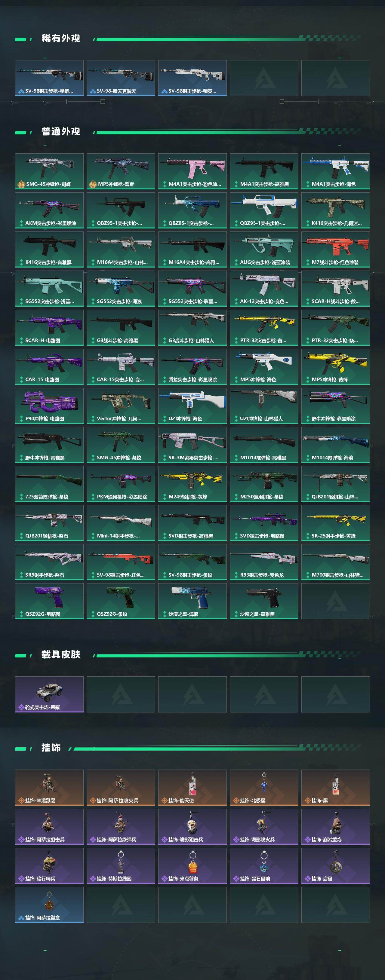 【稀有外观】:M7战斗步枪-天际线,AKM突击步枪-战术演练,AKM突击步枪-肃杀,QBZ95-1突击步枪-公平竞技,ASh-12战斗步枪-繁盛,K416突击步枪-虎啸,AUG突击步枪-前沿科技,M7战斗步枪-捣蛋鬼,SCAR-H战斗步枪-荣耀列队,SCAR-H战斗步枪-黄昏,G3战斗步枪-战术演练,G3战斗步枪-主宰,腾龙突击步枪-雪崩,K437突击步枪-天狼星,K437突击步枪-生存指令,MK47突击步枪-精英联盟,MP5冲锋枪-前沿科技,MP5冲锋枪-弄臣,MP5冲锋枪-虎啸,MP5冲锋枪-哈夫克卫队,P90冲锋枪-黄昏,P90冲锋枪-捣蛋鬼,UZI冲锋枪-亚特兰蒂斯,野牛冲锋枪-前沿科技,SMG