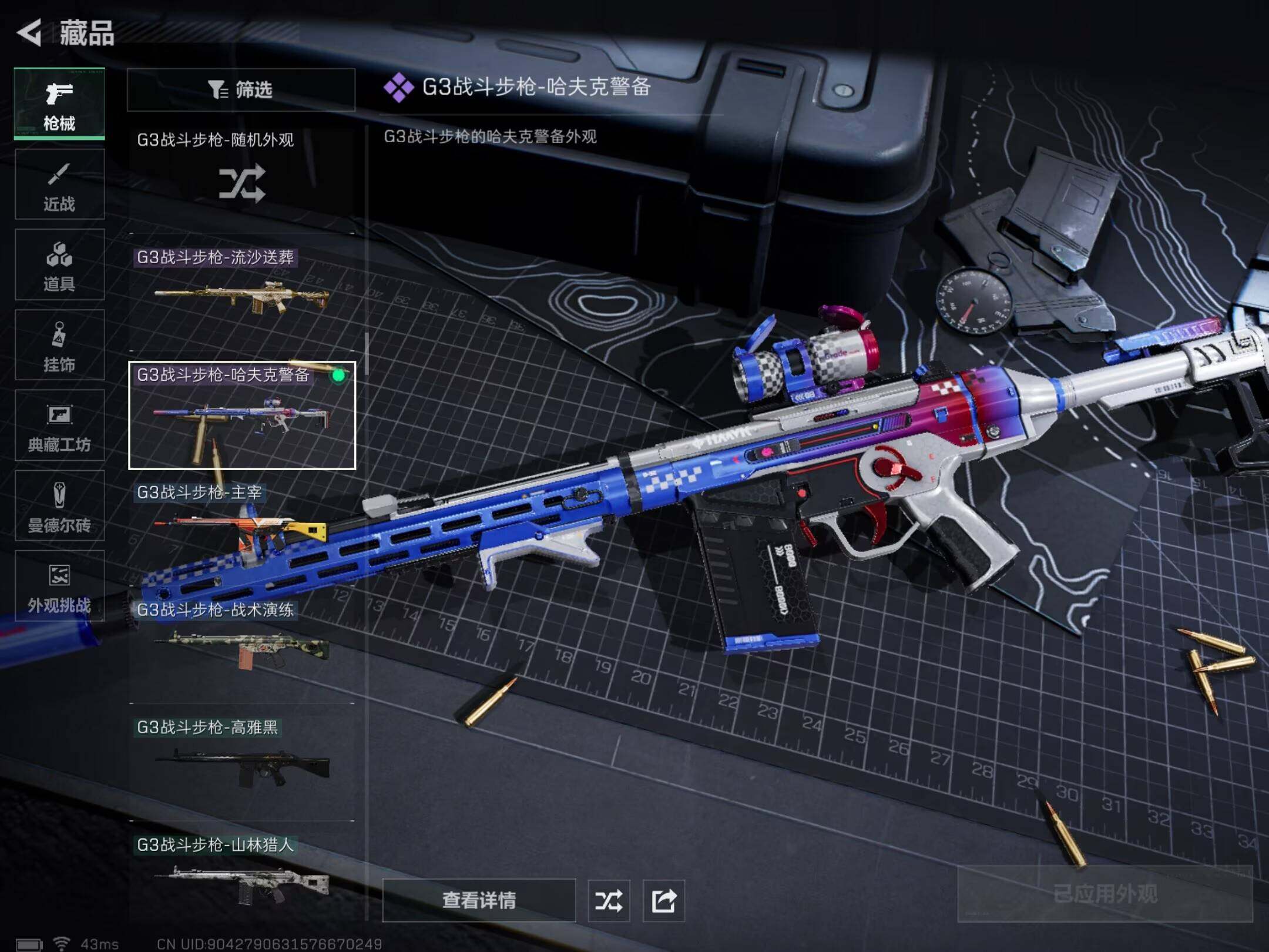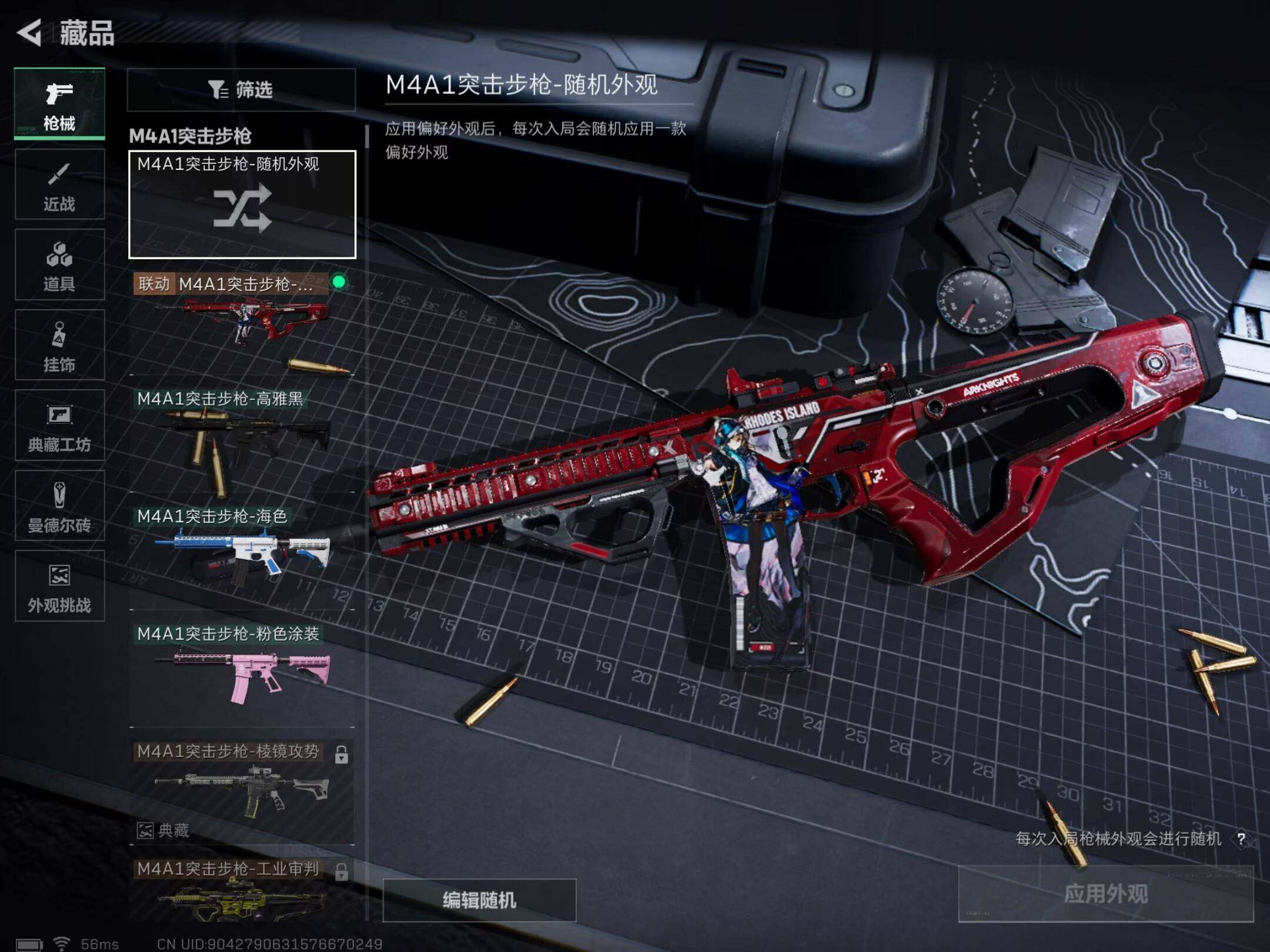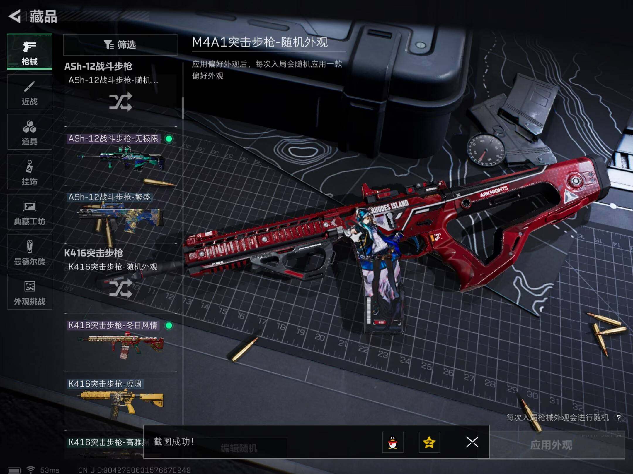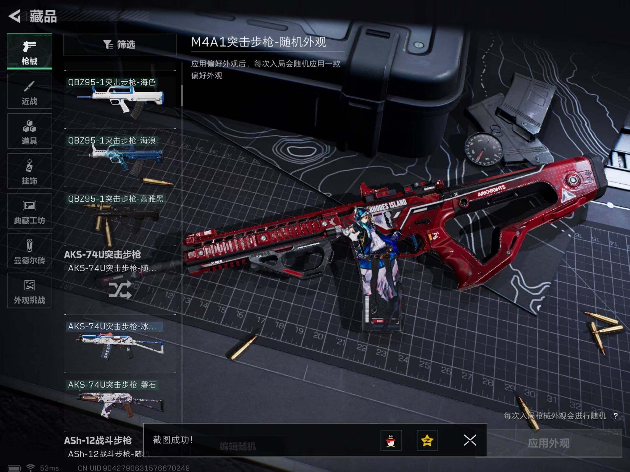 【稀有外观】:M7战斗步枪-天际线,AKM突击步枪-战术演练,AKM突击步枪-肃杀,QBZ95-1突击步枪-公平竞技,ASh-12战斗步枪-繁盛,K416突击步枪-虎啸,AUG突击步枪-前沿科技,M7战斗步枪-捣蛋鬼,SCAR-H战斗步枪-荣耀列队,SCAR-H战斗步枪-黄昏,G3战斗步枪-战术演练,G3战斗步枪-主宰,腾龙突击步枪-雪崩,K437突击步枪-天狼星,K437突击步枪-生存指令,MK47突击步枪-精英联盟,MP5冲锋枪-前沿科技,MP5冲锋枪-弄臣,MP5冲锋枪-虎啸,MP5冲锋枪-哈夫克卫队,P90冲锋枪-黄昏,P90冲锋枪-捣蛋鬼,UZI冲锋枪-亚特兰蒂斯,野牛冲锋枪-前沿科技,SMG