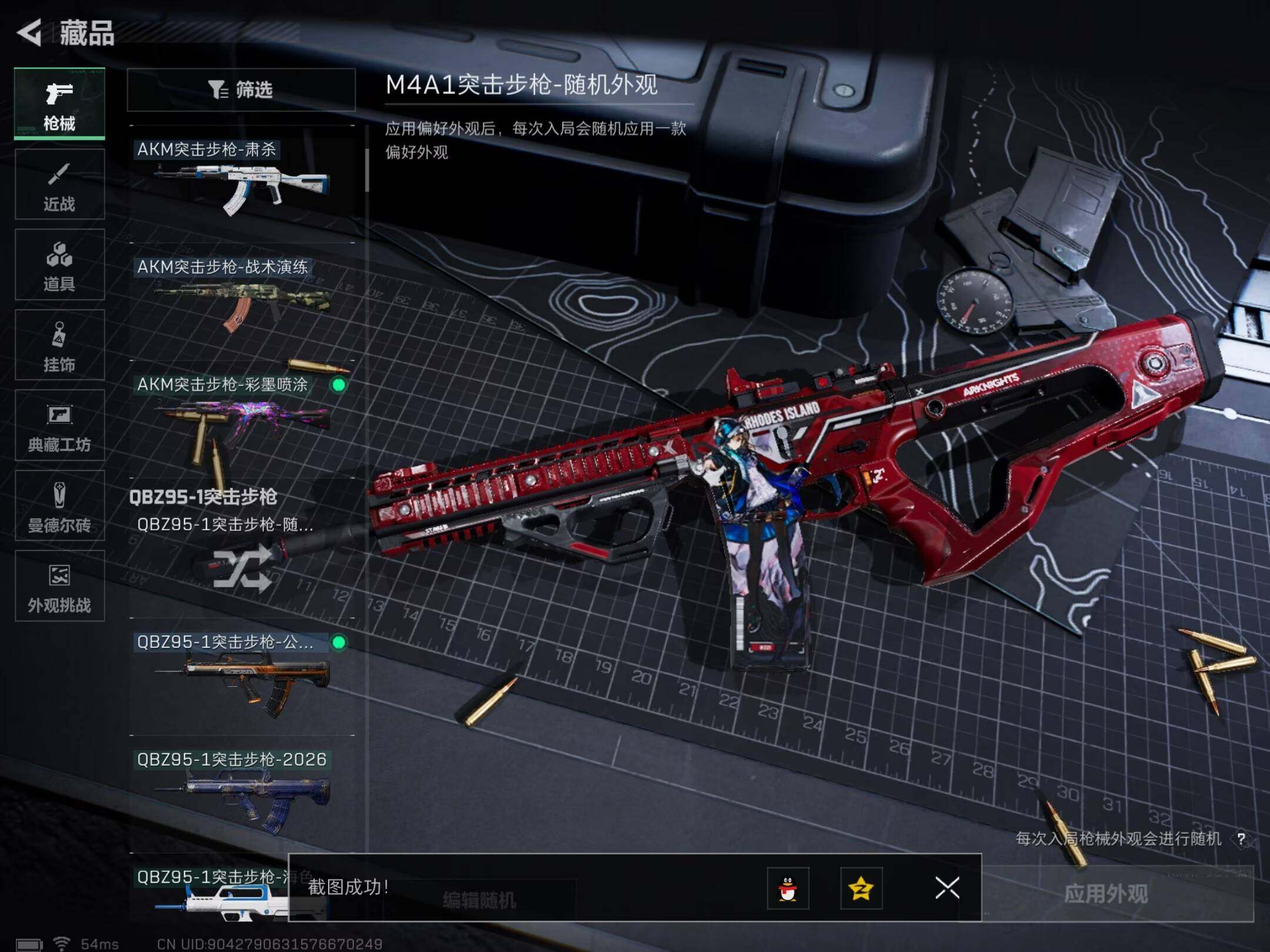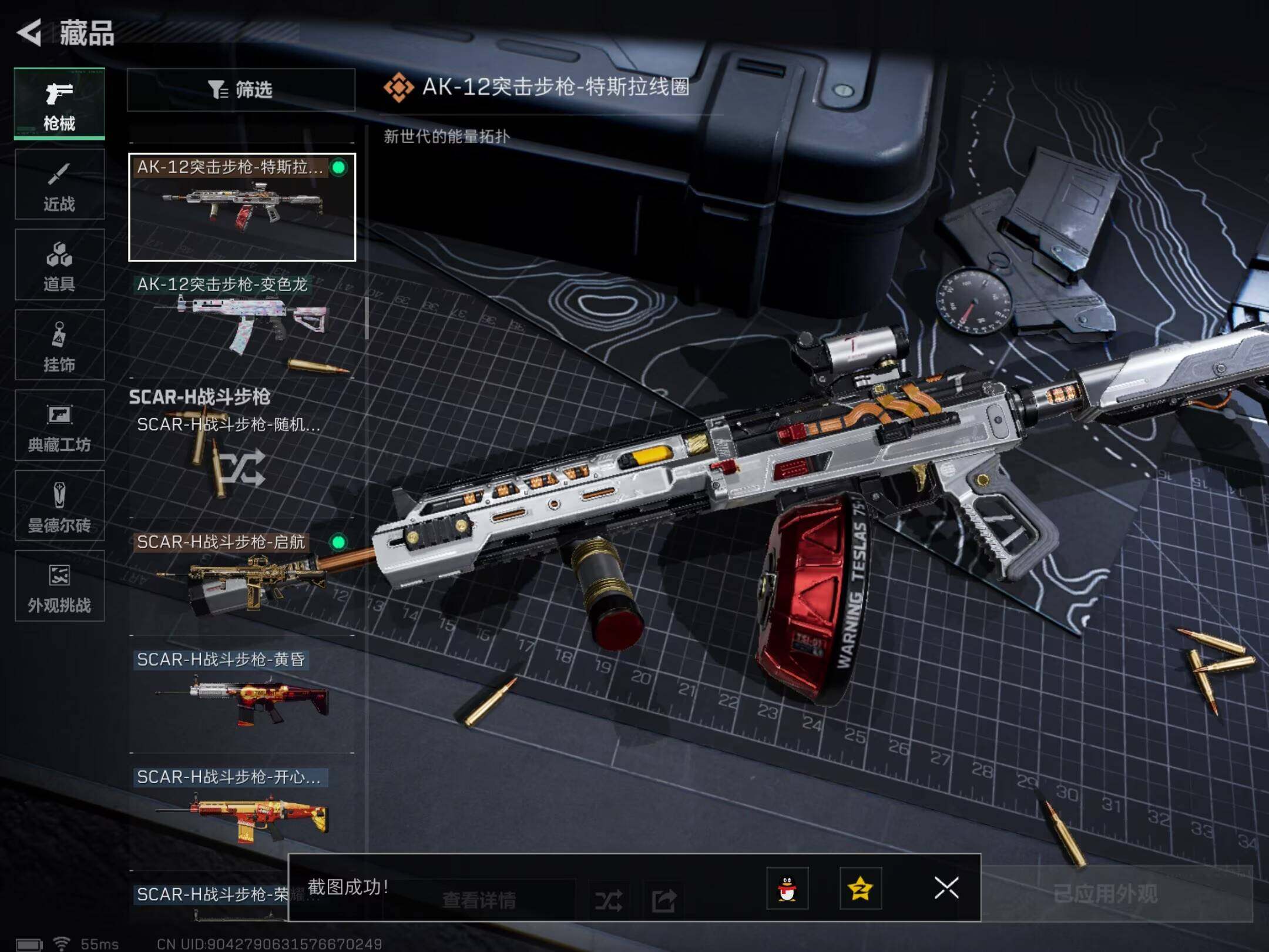 【传说外观】:M4A1突击步枪-阿米娅,M7战斗步枪-零度协议,SG552突击步枪-运动员,AK-12突击步枪-特斯拉线圈,SCAR-H战斗步枪-启航,CAR-15突击步枪-阿米娅,腾龙突击步枪-捞点薯条,K437突击步枪-北极星,KC17突击步枪-电锯惊魂,UZI冲锋枪-特斯拉线圈,SR-3M紧凑突击步枪-特斯拉线圈,勇士冲锋枪-能天使-午夜邮差,QCQ171冲锋枪-北极星,725双管霰弹枪-送葬人-无题密令,M250通用机枪-骑士之心,AWM狙击步枪-捞点薯条,93R-捞点薯条,复合弓-黑·天际线