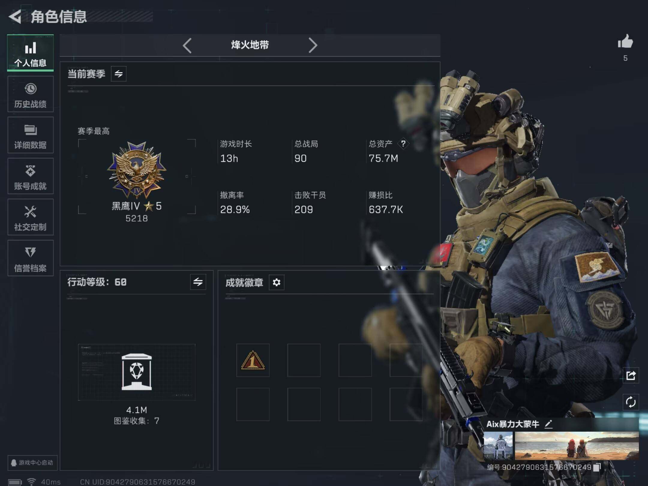 [16143421]【特价出售/店主推荐】75m总资产-514k哈伏币-60烽火等级-黑鹰-13战场等级-列兵