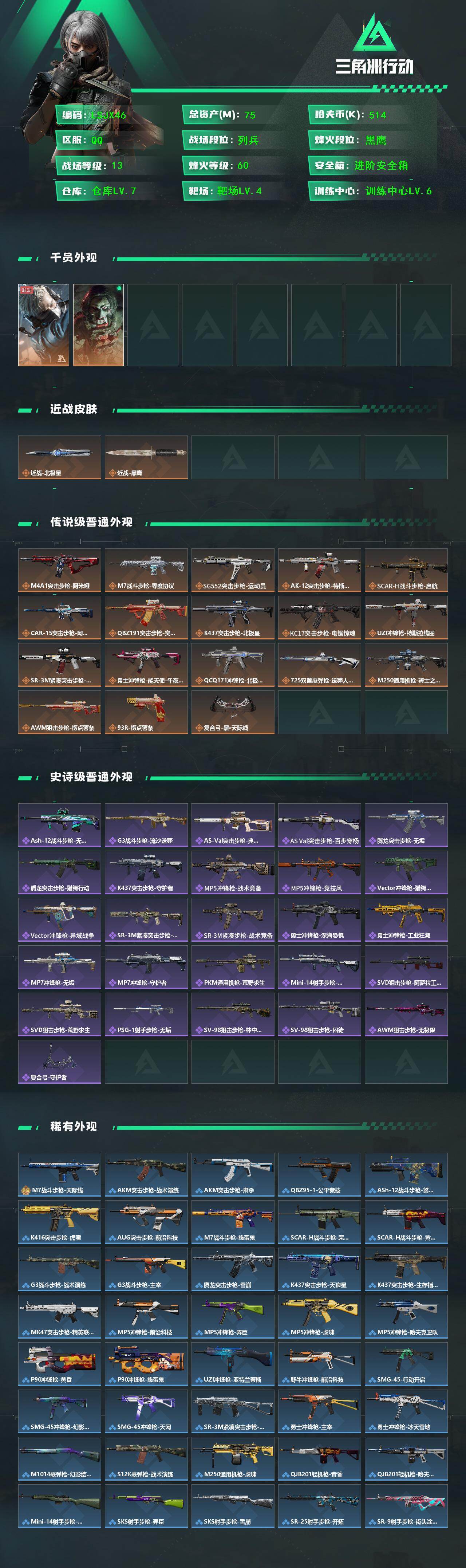 [16143421]【特价出售/店主推荐】75m总资产-514k哈伏币-60烽火等级-黑鹰-13战场等级-列兵 【干员外观】:蜂医-送葬人·无题密令,红狼-电锯惊魂 【近战皮肤】:近战-北极星,近战-黑鹰 【传说外观】:M4A1突击步枪-阿米娅,M7战斗步枪-零度协议,SG552突击步枪-运动员,AK-12突击步枪-特斯拉线圈,SCAR-H战斗步枪-启航,CAR-15突击步枪-阿米娅,腾龙突击步枪-捞点薯条,K437突击步枪-北极星,KC17突击步枪-电锯惊魂,UZI冲锋枪-特斯拉线圈,SR-3M紧凑突击步枪-特斯拉线圈,勇士冲锋枪-能天使-午夜邮差,QCQ171冲锋枪-北极星,725双管霰弹枪-送葬人-无题密令,M250通用机枪-骑士之心,AWM狙击步枪-捞点薯条,93R-捞点薯条,复合弓-黑·天际线 【史诗外观】:ASh-12战斗步枪-无极限,G3战斗步枪-流沙送葬,AS Val突击步枪-典狱官,AS Val突击步枪-百步穿杨,腾龙突击步枪-无垢,腾龙突击步枪-猎鳄行动,K437突击步枪-守护者,MP5冲锋枪-战术竞备,MP5冲锋枪-竞技风,Vector冲锋枪-猎鳄行动,Vector冲锋枪-异域战争,SR-3M紧凑突击步枪-荒野求生,SR-3M紧凑突击步枪-战术竞备,勇士冲锋枪-深海恐惧,勇士冲锋枪-工业狂潮,MP7冲锋枪-无垢,MP7冲锋枪-守护者,PKM通用机枪-荒野求生,Mini-14射手步枪-守护者,SVD狙击步枪-阿萨拉工艺,SVD狙击步枪-荒野求生,PSG-1射手步枪-无垢,SV-98狙击步枪-林中猎手,SV-98狙击步枪-囚徒,AWM狙击步枪-无极限,复合弓-守护者 【稀有外观】:M7战斗步枪-天际线,AKM突击步枪-战术演练,AKM突击步枪-肃杀,QBZ95-1突击步枪-公平竞技,ASh-12战斗步枪-繁盛,K416突击步枪-虎啸,AUG突击步枪-前沿科技,M7战斗步枪-捣蛋鬼,SCAR-H战斗步枪-荣耀列队,SCAR-H战斗步枪-黄昏,G3战斗步枪-战术演练,G3战斗步枪-主宰,腾龙突击步枪-雪崩,K437突击步枪-天狼星,K437突击步枪-生存指令,MK47突击步枪-精英联盟,MP5冲锋枪-前沿科技,MP5冲锋枪-弄臣,MP5冲锋枪-虎啸,MP5冲锋枪-哈夫克卫队,P90冲锋枪-黄昏,P90冲锋枪-捣蛋鬼,UZI冲锋枪-亚特兰蒂斯,野牛冲锋枪-前沿科技,SMG