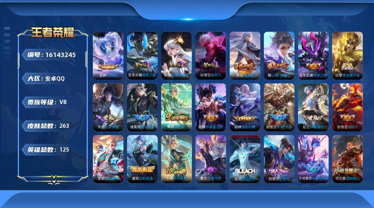 [16143245]【店主推荐捡漏号!可直接换绑】安卓Q-V8-最强王者段位-125英雄-263皮肤-1典藏皮肤-15传说-70史诗