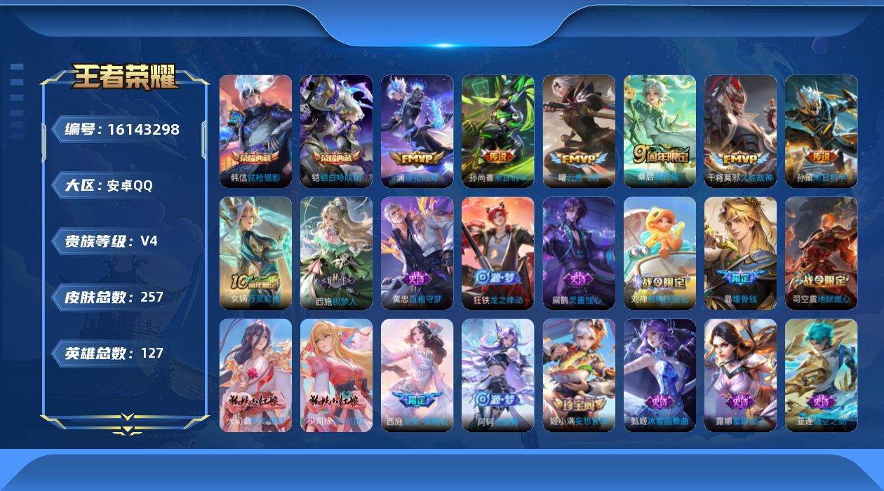 [16143298]【特价出售/店主推荐】安卓Q-V4-最强王者段位-127英雄-257皮肤-2典藏皮肤-7传说-84史诗