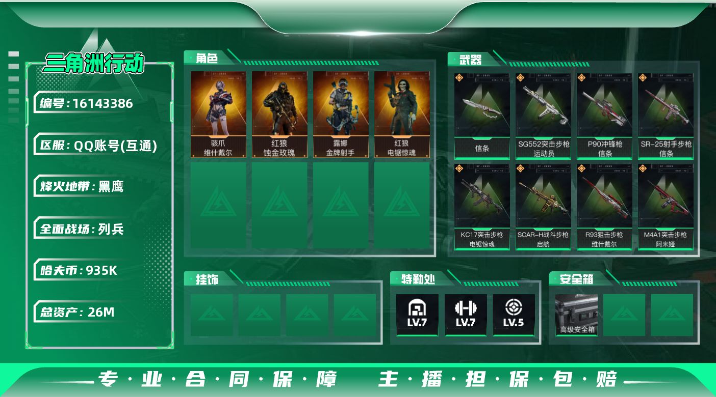 [16143386]【特价出售/店主推荐】26m总资产-935k哈伏币-60烽火等级-黑鹰-13战场等级-列兵 【干员外观】:红狼-蚀金玫瑰,骇爪-维什戴尔,红狼-电锯惊魂,露娜-金牌射手 【近战皮肤】:近战-信条,近战-黑鹰 【传说外观】:M4A1突击步枪-蚀金玫瑰,M4A1突击步枪-阿米娅,SG552突击步枪-运动员,SCAR-H战斗步枪-启航,KC17突击步枪-电锯惊魂,P90冲锋枪-信条,SR-25射手步枪-信条,R93狙击步枪-维什戴尔 【史诗外观】:ASh-12战斗步枪-碎冰行动,QBZ95-1突击步枪-曙光,M7战斗步枪-百步穿杨,G3战斗步枪-流沙送葬,AS Val突击步枪-百步穿杨,腾龙突击步枪-猎鳄行动,MP5冲锋枪-战术竞备,MP5冲锋枪-竞技风,Vector冲锋枪-阿萨拉文明,Vector冲锋枪-百步穿杨,勇士冲锋枪-工业狂潮,SV-98狙击步枪-猎鳄行动,M700狙击步枪-蝮蛇,M700狙击步枪-百步穿杨,AWM狙击步枪-流沙送葬 【稀有外观】:M4A1突击步枪-繁盛,AKM突击步枪-肃杀,QBZ95-1突击步枪-公平竞技,ASh-12战斗步枪-繁盛,M7战斗步枪-捣蛋鬼,SCAR-H战斗步枪-荣耀列队,G3战斗步枪-前沿科技,腾龙突击步枪-冰天雪地,MP5冲锋枪-弄臣,MP5冲锋枪-哈夫克卫队,P90冲锋枪-黄昏,UZI冲锋枪-前沿科技,UZI冲锋枪-亚特兰蒂斯,野牛冲锋枪-前沿科技,SMG-45-行动开启,勇士冲锋枪-主宰,勇士冲锋枪-冰天雪地,M1014霰弹枪-幻影结构,M249轻机枪-毛鲁斯之力,QJB201轻机枪-哈夫克卫队,Mini-14射手步枪-荣耀列队,PSG-1射手步枪-主宰,SV-98狙击步枪-星链科技,SV-98狙击步枪-哈夫克航天,SV-98狙击步枪-精英联盟,G18-星链科技,G18-哈夫克航天 【普通外观】:M4A1突击步枪-高雅黑,QBZ95-1突击步枪-高雅黑,K416突击步枪-几何迷彩,K416突击步枪-高雅黑,M16A4突击步枪-高雅黑,AUG突击步枪-浅蓝涂装,M7战斗步枪-红色涂装,SG552突击步枪-浅蓝涂装,SG552突击步枪-海浪,AK-12突击步枪-变色龙,SCAR-H战斗步枪-数码迷彩,G3战斗步枪-高雅黑,PTR-32突击步枪-黄蜂,CAR-15突击步枪-变色龙,K437突击步枪-磐石,MP5冲锋枪-黄蜂,