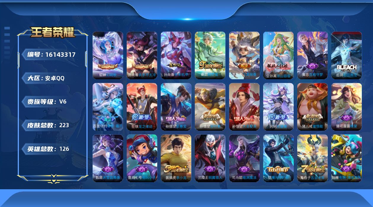 [16143317]【特价出售/店主推荐】安卓Q-V6-最强王者段位-126英雄-223皮肤-2典藏皮肤-3传说-59史诗-1星元