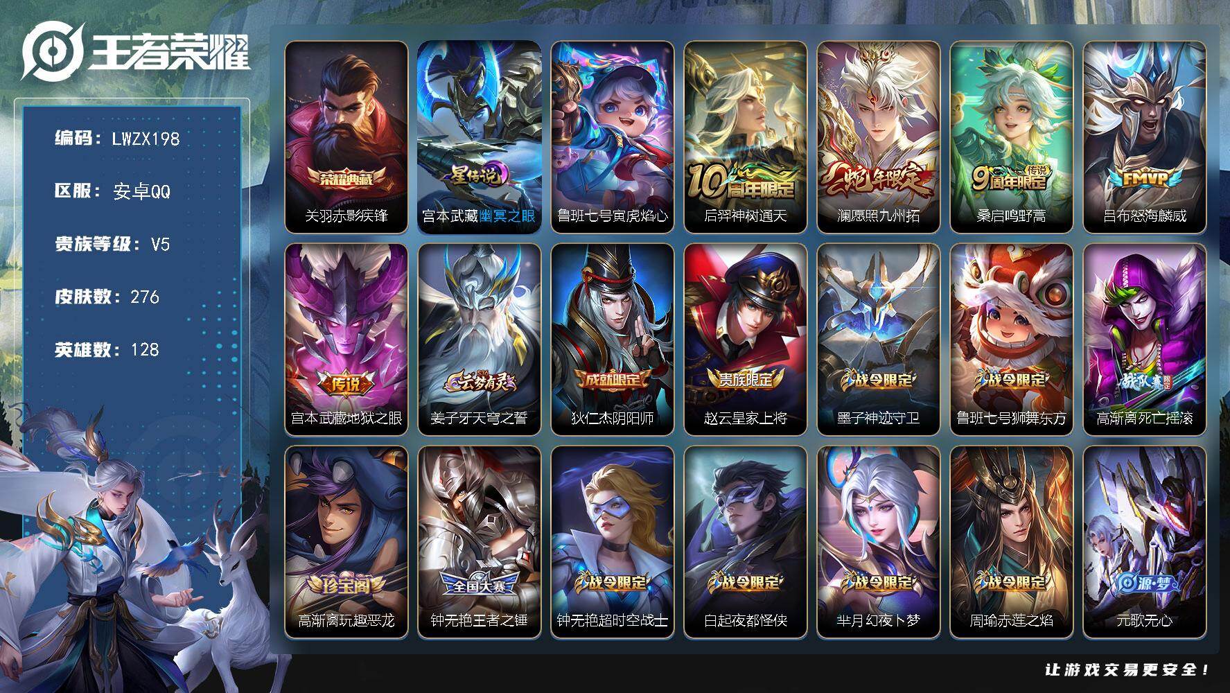 [16143349]可二次【特价出售/店主推荐】安卓Q-V5-最强王者段位-128英雄-276皮肤-1典藏皮肤-5传说-78史诗-2星元