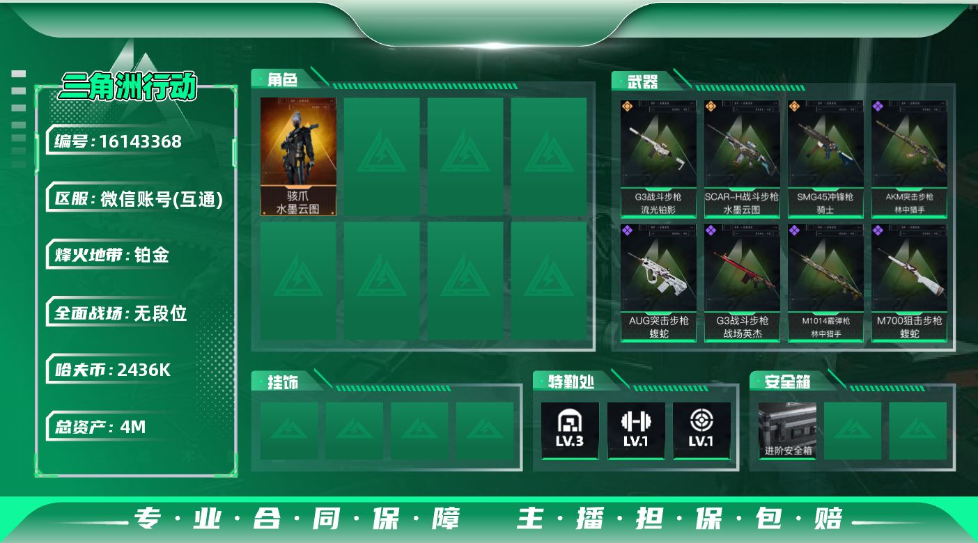 [16143368]4m总资产-2436k哈伏币-53烽火等级-铂金-1战场等级-无军衔 【干员外观】:骇爪-水墨云图 【近战皮肤】:近战-黑鹰 【传说外观】:SCAR-H战斗步枪-水墨云图,G3战斗步枪-流光铂影,SMG-45冲锋枪-骑士 【史诗外观】:AKM突击步枪-林中猎手,AUG突击步枪-蝮蛇,G3战斗步枪-战场英杰,MP5冲锋枪-深海恐惧,勇士冲锋枪-深海恐惧,M1014霰弹枪-林中猎手,S12K霰弹枪-曙光,SVD狙击步枪-阿萨拉工艺,SVD狙击步枪-暗夜猎手,M700狙击步枪-蝮蛇 【稀有外观】:M4A1突击步枪-刚枪之王,ASh-12战斗步枪-星链科技,ASh-12战斗步枪-哈夫克航天,K416突击步枪-街头涂鸦,MP5冲锋枪-弄臣,P90冲锋枪-浅鲨小队,P90冲锋枪-新生,Vector冲锋枪-先锋,Vector冲锋枪-街头涂鸦,SMG-45-行动开启,SMG-45冲锋枪-幻影结构,MP7冲锋枪-幻影结构,M1014霰弹枪-幻影结构,M1014霰弹枪-童趣,PKM通用机枪-英雄,VSS射手步枪-童趣,SKS射手步枪-弄臣,SR-25射手步枪-开拓,SR-25射手步枪-蜂窝科技,SV-98狙击步枪-星链科技,SV-98狙击步枪-哈夫克航天,SV-98狙击步枪-精英联盟,G18-星链科技,G18-哈夫克航天 【普通外观】:Mini-14射手步枪-黄铜,M4A1突击步枪-粉色涂装,M4A1突击步枪-高雅黑,M4A1突击步枪-海色,QBZ95-1突击步枪-高雅黑,QBZ95-1突击步枪-海浪,QBZ95-1突击步枪-海色,QBZ191突击步枪-三角洲力量,K416突击步枪-几何迷彩,K416突击步枪-高雅黑,AUG突击步枪-浅蓝涂装,M7战斗步枪-红色涂装,SG552突击步枪-浅蓝涂装,SG552突击步枪-海浪,AK-12突击步枪-冰川,AK-12突击步枪-落花,SCAR-H战斗步枪-数码迷彩,G3战斗步枪-高雅黑,MP5冲锋枪-安全工作,MP5冲锋枪-海色,P90冲锋枪-安全工作,Vector冲锋枪-几何迷彩,UZI冲锋枪-海色,QCQ171冲锋枪-三角洲力量,M1014霰弹枪-高雅黑,M1014霰弹枪-海浪,SV-98狙击步枪-红色涂装,.357左轮-精钢,沙漠之鹰-海浪,M1911-坚固材料 【军牌】:军牌-装备修理,军牌-夜间撤离,军牌-静谧时光,军牌-展示,军牌-