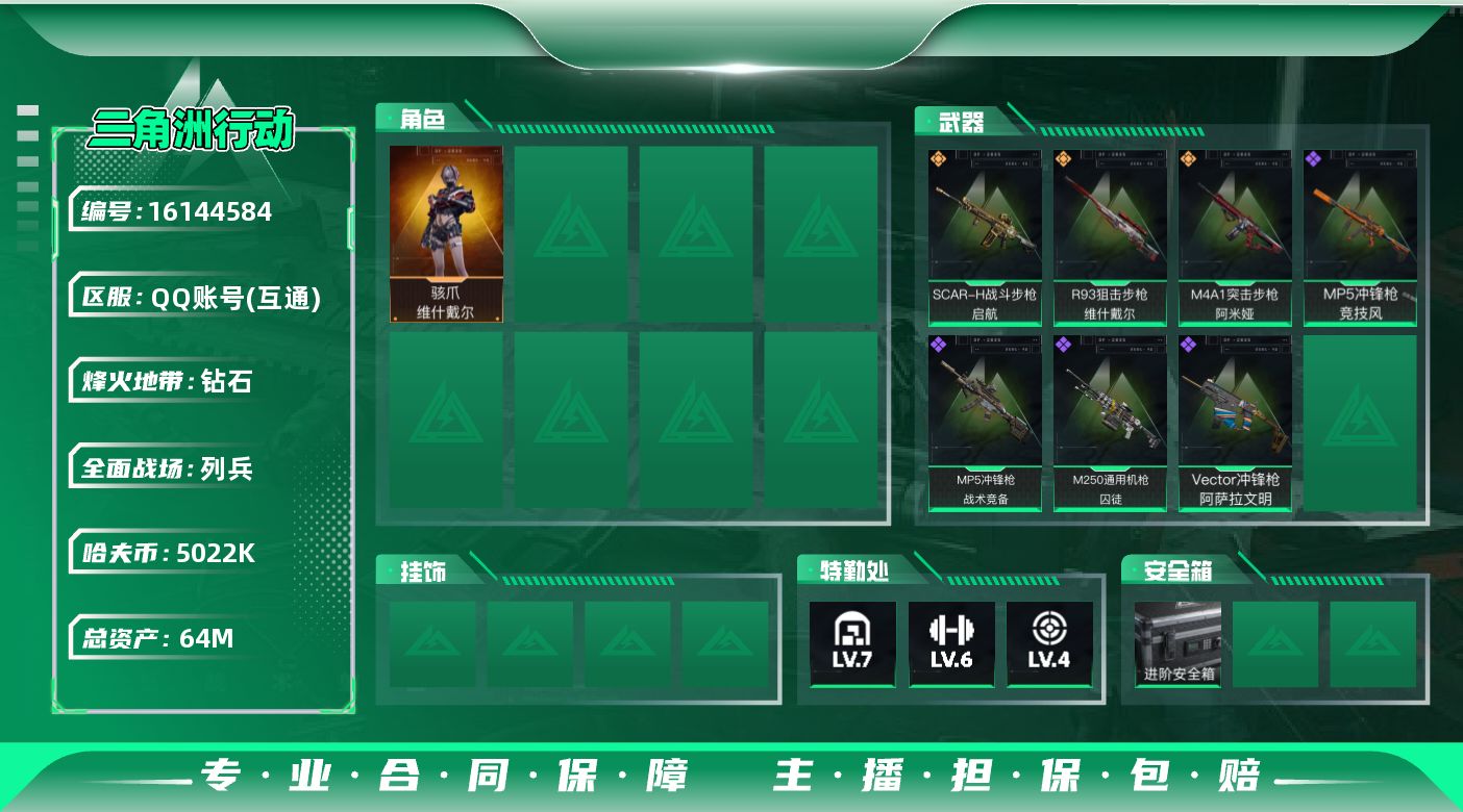 [16144584]64m总资产-5022k哈伏币-58烽火等级-钻石-15战场等级-列兵 【干员外观】:骇爪-维什戴尔 【近战皮肤】:近战-黑鹰 【传说外观】:M4A1突击步枪-阿米娅,SCAR-H战斗步枪-启航,R93狙击步枪-维什戴尔 【史诗外观】:MP5冲锋枪-战术竞备,MP5冲锋枪-竞技风,Vector冲锋枪-阿萨拉文明,M250通用机枪-囚徒 【稀有外观】:AKM突击步枪-肃杀,M7战斗步枪-捣蛋鬼,SCAR-H战斗步枪-荣耀列队,K437突击步枪-生存指令,MK47突击步枪-精英联盟,MP5冲锋枪-哈夫克卫队,SMG-45-行动开启,勇士冲锋枪-冰天雪地,QJB201轻机枪-哈夫克卫队,Mini-14射手步枪-荣耀列队,SR-25射手步枪-开拓,G18-星链科技,G18-哈夫克航天 【普通外观】:M4A1突击步枪-粉色涂装,QBZ95-1突击步枪-高雅黑,QBZ95-1突击步枪-海浪,K416突击步枪-几何迷彩,K416突击步枪-高雅黑,M16A4突击步枪-高雅黑,AUG突击步枪-浅蓝涂装,M7战斗步枪-红色涂装,SG552突击步枪-海浪,G3战斗步枪-高雅黑,MP5冲锋枪-海色,MP5冲锋枪-黄蜂,Vector冲锋枪-几何迷彩,UZI冲锋枪-海色,M1014霰弹枪-海浪,M250通用机枪-条纹,SR-25射手步枪-黄蜂,SV-98狙击步枪-红色涂装,QSZ92G-条纹,沙漠之鹰-海浪,沙漠之鹰-高雅黑 【载具外观】:轮式突击炮-荣耀 【军牌】:军牌-装备修理,军牌-静谧时光,军牌-来点薯条,军牌-修整,军牌-神秘艺术,军牌-信誉优秀,军牌-小心鳄鱼 【挂饰】:挂饰-维什戴尔,挂饰-蚀金玫瑰,挂饰-阿萨拉狙击兵,挂饰-阿萨拉霰弹兵,挂饰-诡影狙击兵,挂饰-诡影喷火兵*2,挂饰-崩岩重炮*2,挂饰-暗行哨兵,挂饰-启程,挂饰-阿萨拉徽章