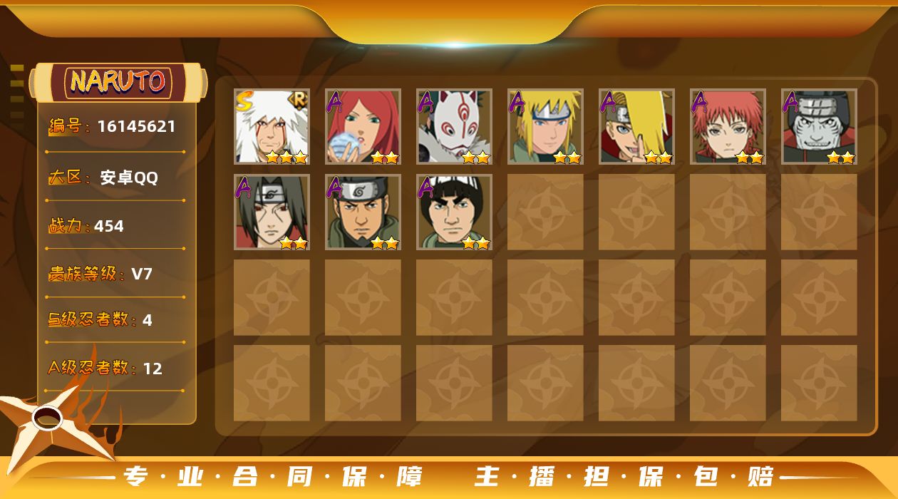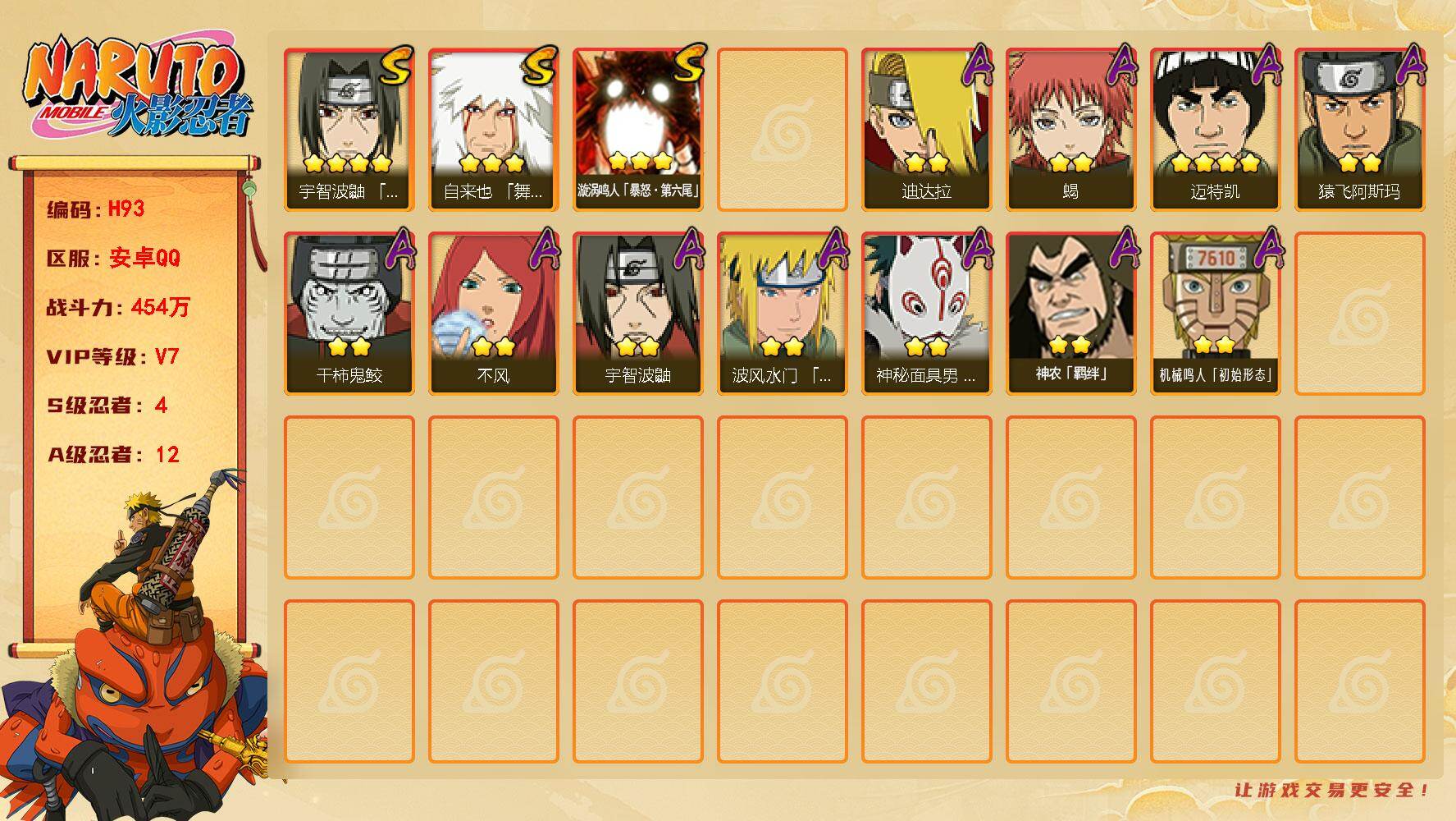 【S级忍者】:宇智波鼬「须佐能乎」(4星),自来也「舞之豪杰」(3星),漩涡鸣人「暴怒·第六尾」(3星),漩涡鸣人·宇智波佐助(3星)