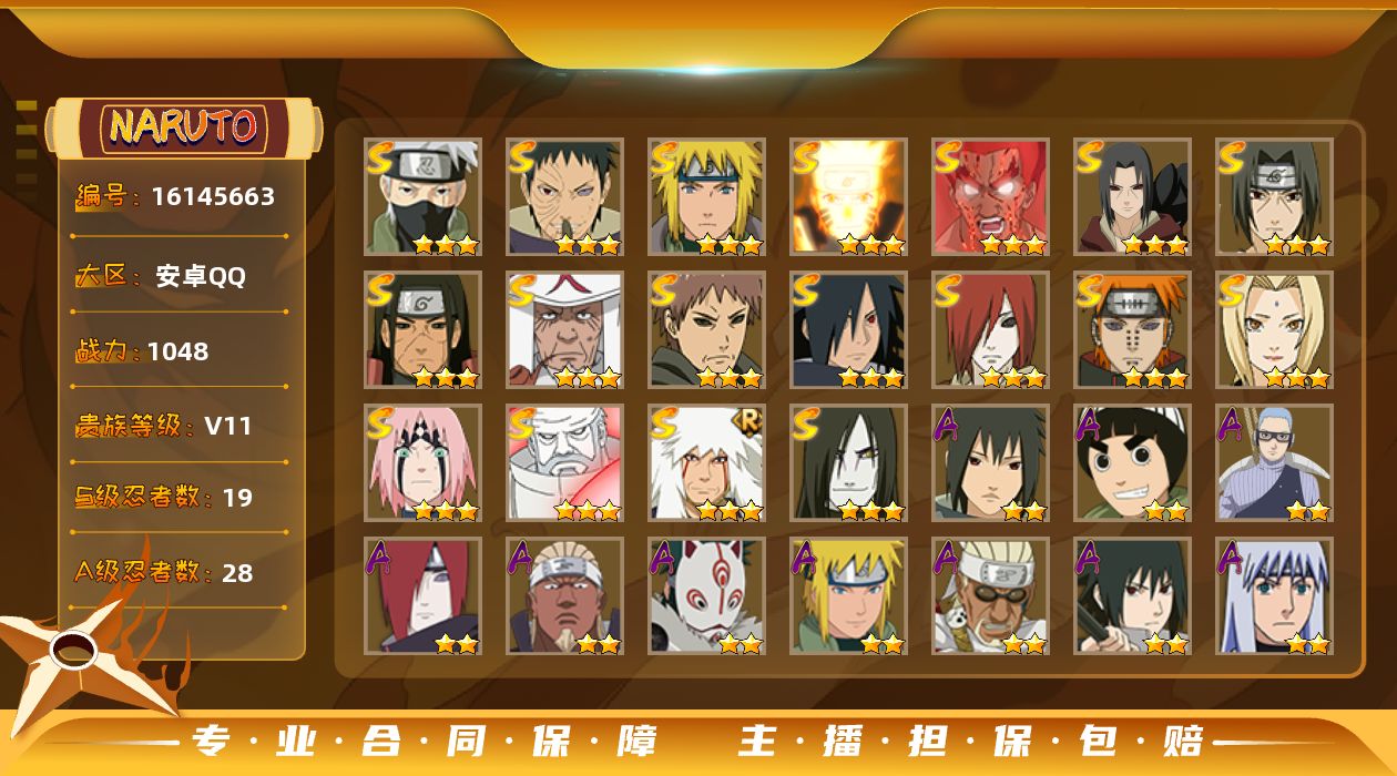 - [12232763]V11 22S忍 48A忍 21通灵 1123.7W战力 可二次 可修改实名 优质装备:熊猫,千手柱间「秽土转生」,宇智波斑「秽土转生」,纲手「百豪」,波风水门「秽土转生」,猿飞日斩「秽土转生」,长门「秽土转生」,宇智波斑,鬼灯幻月「二代目水影」,宇智波带土 「忍界大战」,“宇智波斑” 「白面具」,漩涡鸣人 「九喇嘛连结」,宇智波佐助「永恒万花筒」,宇智波止水「须佐能乎」,旗木卡卡西「须佐能乎」,大筒木舍人 「最终章」,漩涡鸣人 「暴怒·第六尾」 S级忍者:自来也 「舞之豪杰」,宇智波鼬 「须佐能乎」,佩恩「天道」,波风水门,大蛇丸,自来也