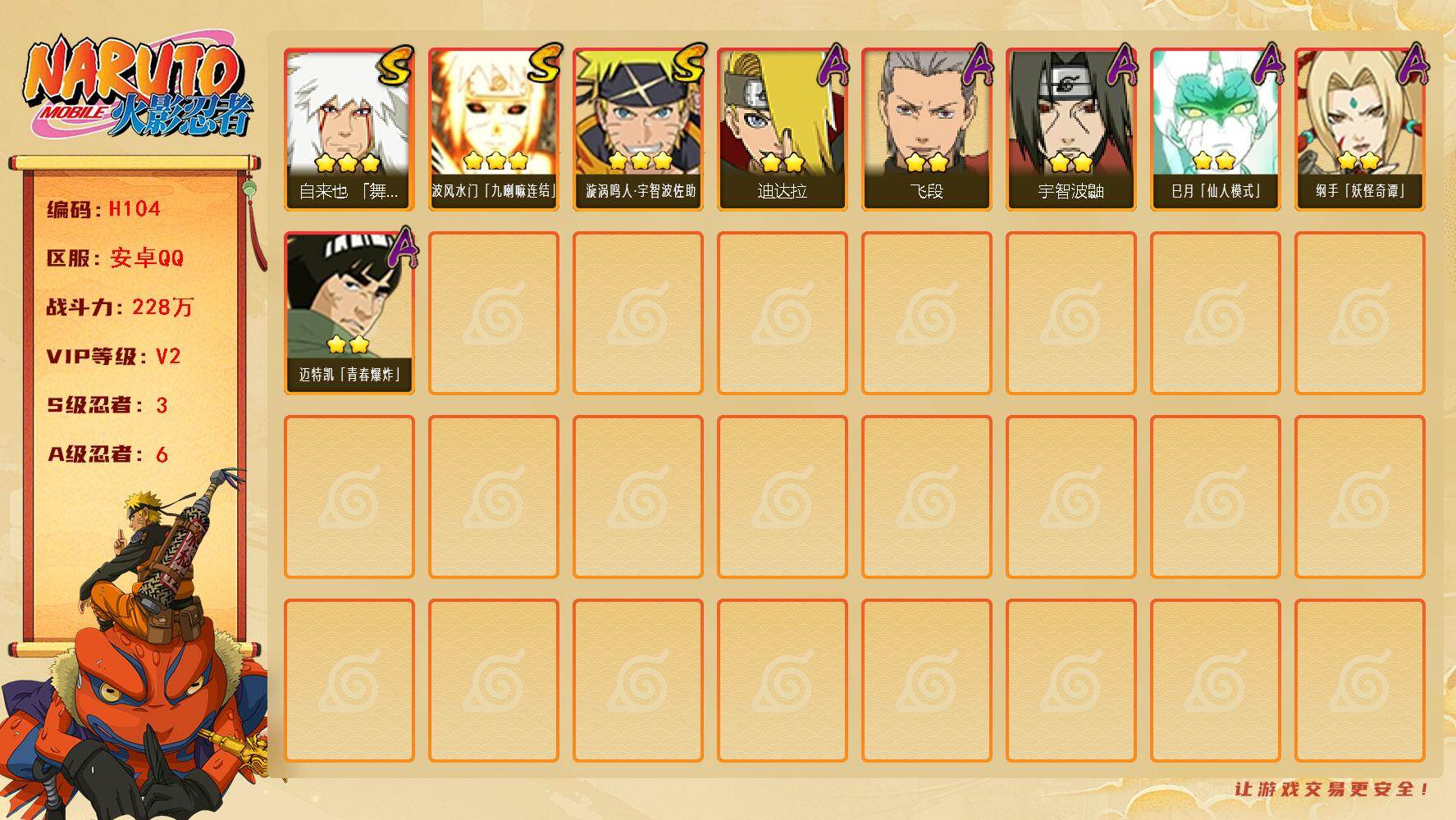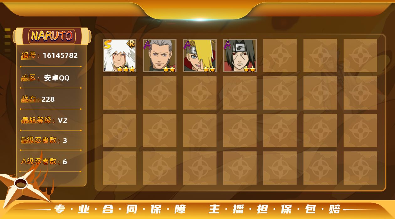 [16145782]3S级忍者数-6A级忍者数 【S级忍者】:自来也「舞之豪杰」(3星),波风水门「九喇嘛连结」(3星),漩涡鸣人·宇智波佐助(3星) 【A级忍者】:迪达拉(2星),飞段(2星),宇智波鼬(2星),巳月「仙人模式」(2星),纲手「妖怪奇谭」(2星),迈特凯「青春爆炸」(2星)