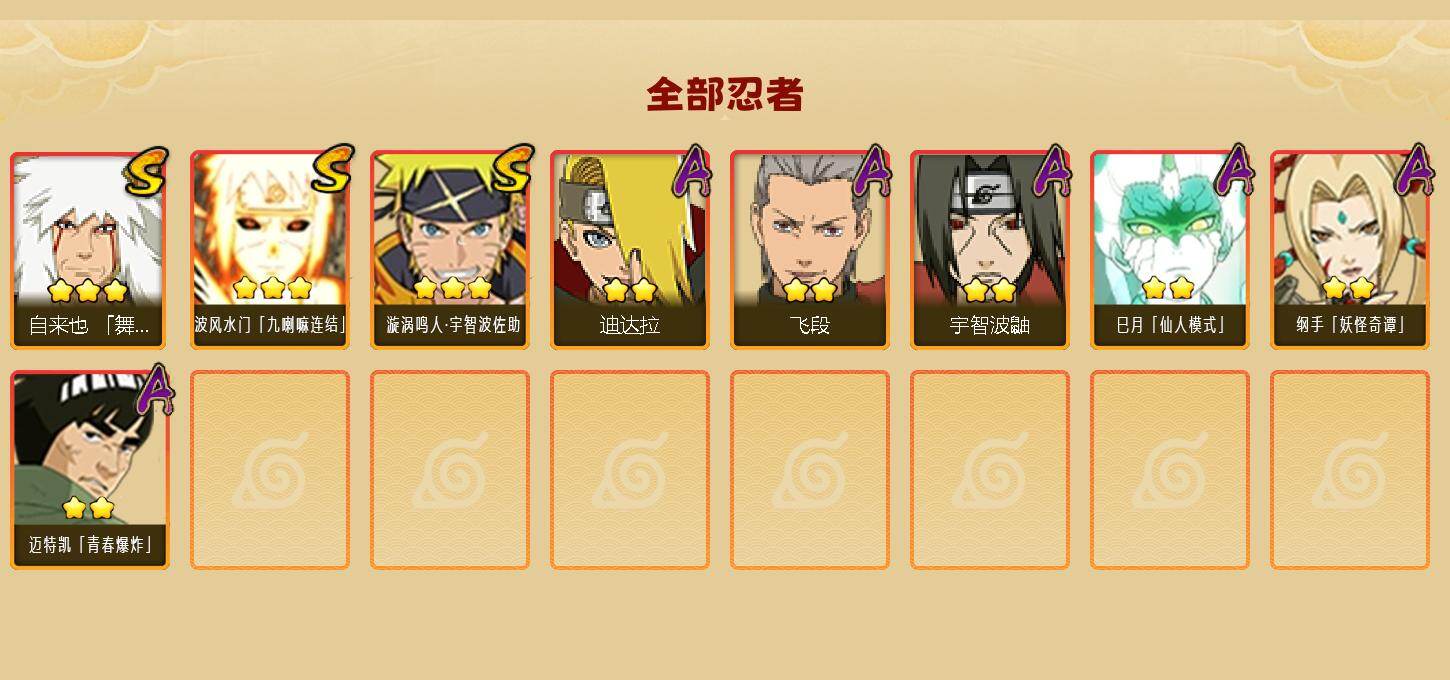 【A级忍者】:迪达拉(2星),飞段(2星),宇智波鼬(2星),巳月「仙人模式」(2星),纲手「妖怪奇谭」(2星),迈特凯「青春爆炸」(2星)