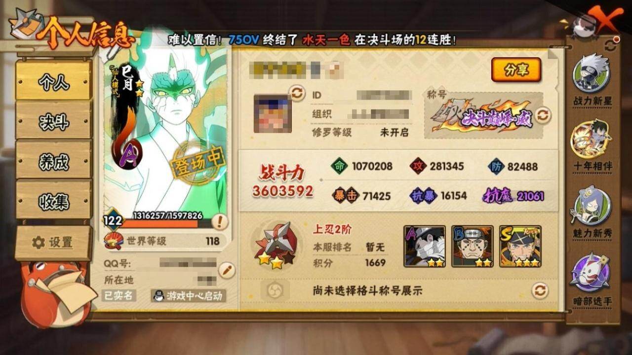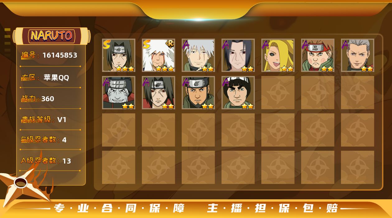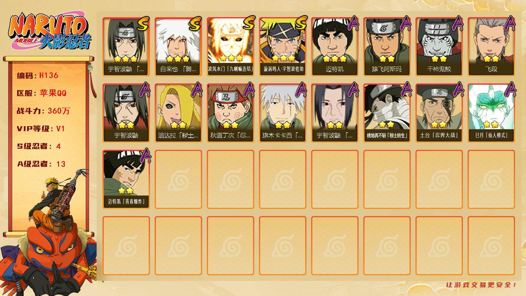 [16145853]V1/战力360W/S忍4/A忍13 3星宇智波鼬「须佐能乎」,3星自来也「舞之豪杰」,3星波风水门「九喇嘛连结」,3星漩涡鸣人·宇智波佐助,3星迈特凯,2星猿飞阿斯玛,2星干柿鬼鲛,2星飞段,2星宇智波鼬,2星迪达拉「秽土转生」,2星秋道丁次「忍界大战」,2星旗木卡卡西「幻之真容」,2星宇智波鼬「夏日限定」,2星桃地再不斩「秽土转生」,2星土台「忍界大战」,2星巳月「仙人模式」,2星迈特凯「青春爆炸」
