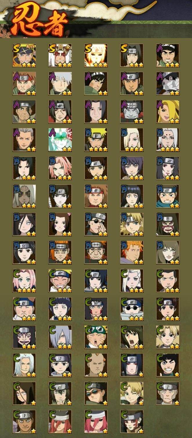 3星宇智波鼬「须佐能乎」,3星自来也「舞之豪杰」,3星波风水门「九喇嘛连结」,3星漩涡鸣人·宇智波佐助,3星迈特凯,2星猿飞阿斯玛,2星干柿鬼鲛,2星飞段,2星宇智波鼬,2星迪达拉「秽土转生」,2星秋道丁次「忍界大战」,2星旗木卡卡西「幻之真容」,2星宇智波鼬「夏日限定」,2星桃地再不斩「秽土转生」,2星土台「忍界大战」,2星巳月「仙人模式」,2星迈特凯「青春爆炸」