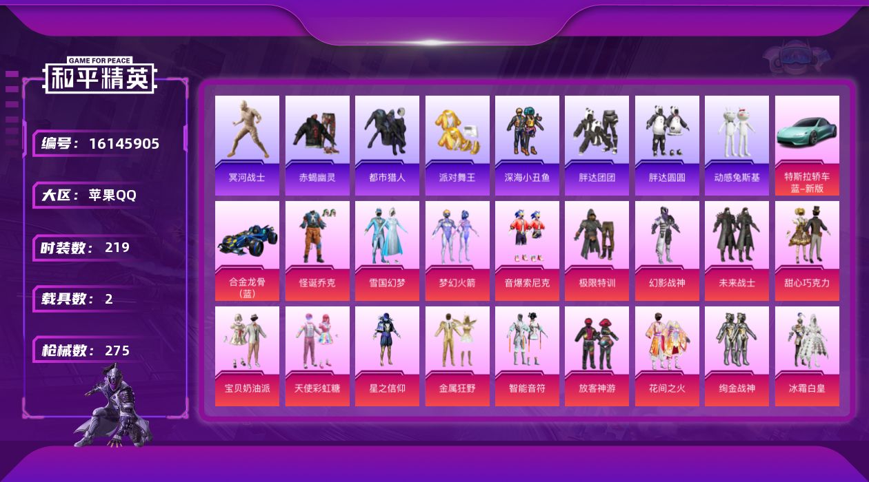 [16145905]可二次【特价出售/店主推荐】苹果 手Q-无敌战神框-26粉装-9特效枪-2载具-5粉色飞行器-106347热力值-16王牌印记-219套装-275枪皮