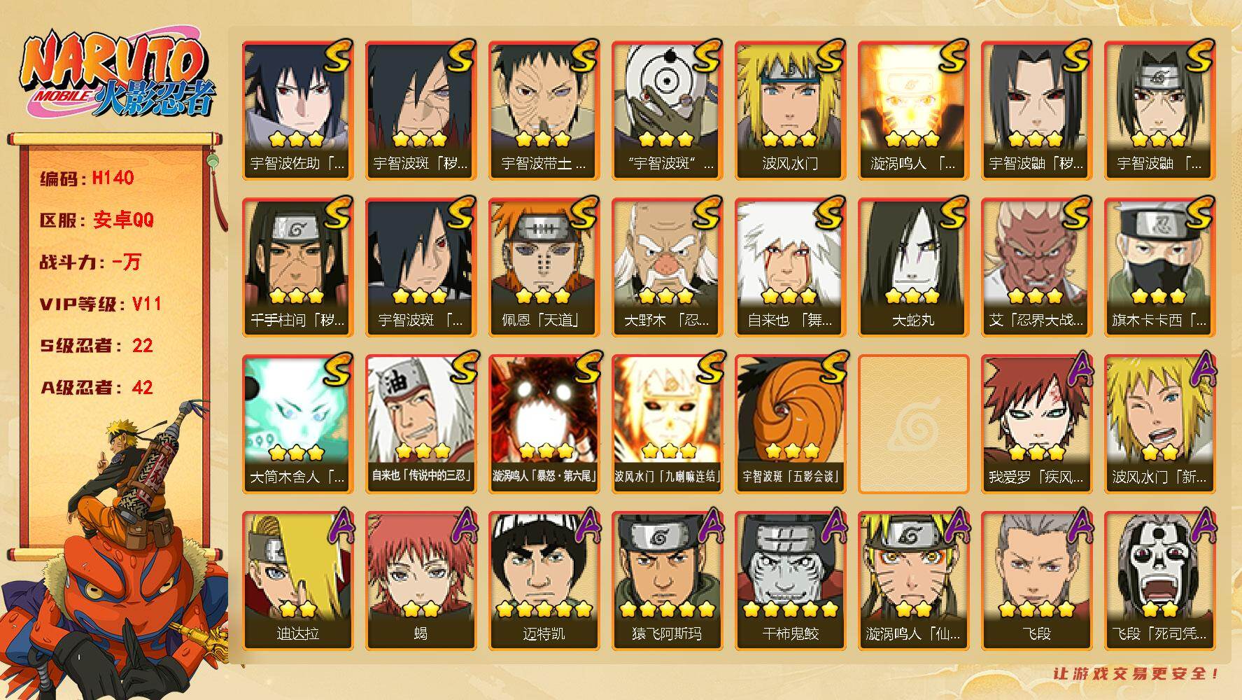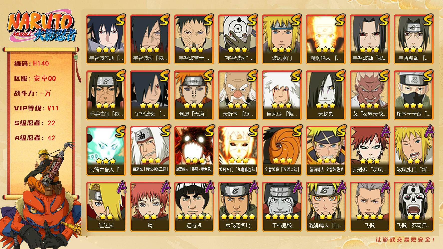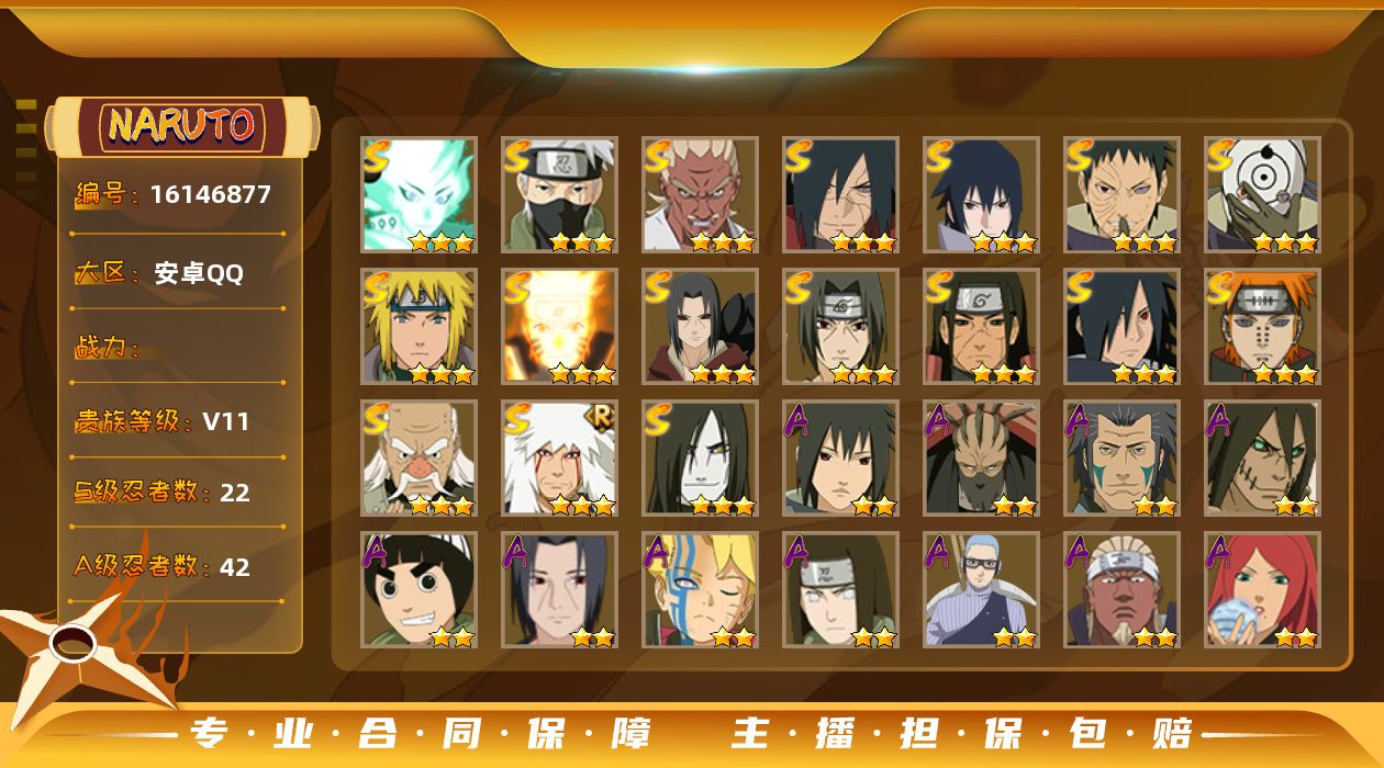 【S级忍者】:千手柱间「秽土转生」(3星),宇智波鼬「秽土转生」(3星),宇智波斑「秽土转生·解」(3星),大野木「忍界大战」(3星),宇智波带土「忍界大战」(3星),艾「忍界大战」(3星),宇智波鼬「须佐能乎」(3星),旗木卡卡西「须佐能乎」(3星),宇智波斑「木叶创立」(3星),自来也「舞之豪杰」(3星),大蛇丸(3星),自来也「传说中的三忍」(3星),波风水门(3星),漩涡鸣人「九喇嘛连结」(3星),佩恩「天道」(3星),宇智波佐助「永恒万花筒」(3星),宇智波斑 「白面具」(3星宇智波斑「白面具」),大筒木舍人「最终章」(3星),漩涡鸣人「暴怒·第六尾」(3星),波风水门「九喇嘛连结」(3星),宇智波斑「五影会谈」(3星),漩涡鸣人·宇智波佐助(3星)