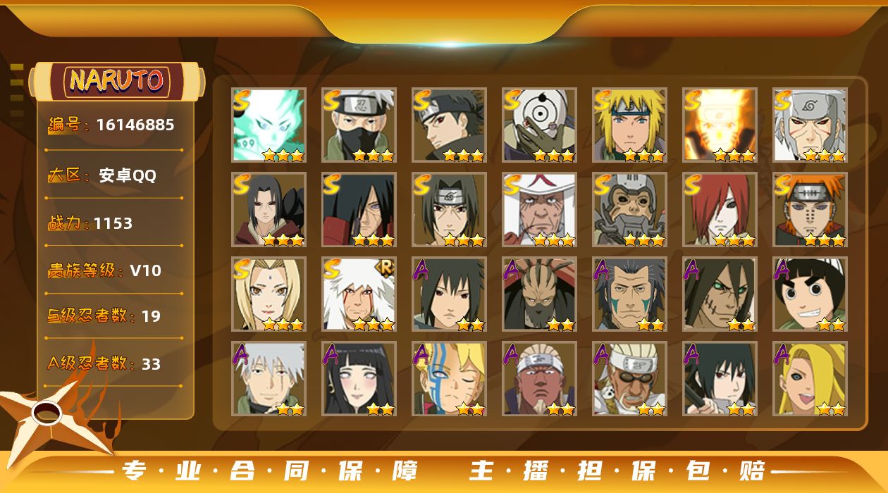 【S级忍者】:长门「秽土转生」(3星),半藏「秽土转生」(3星),千手扉间「秽土转生」(3星),宇智波鼬「秽土转生」(3星),宇智波斑「秽土转生」(3星),宇智波鼬「须佐能乎」(3星),宇智波止水「须佐能乎」(3星),旗木卡卡西「须佐能乎」(3星),自来也「舞之豪杰」(3星),自来也「传说中的三忍」(3星),纲手(4星),猿飞日斩(3星),波风水门(3星),漩涡鸣人「九喇嘛连结」(3星),佩恩「天道」(3星),宇智波斑 「白面具」(3星宇智波斑「白面具」),大筒木舍人「最终章」(3星),漩涡鸣人「暴怒·第六尾」(3星),漩涡鸣人·宇智波佐助(3星)