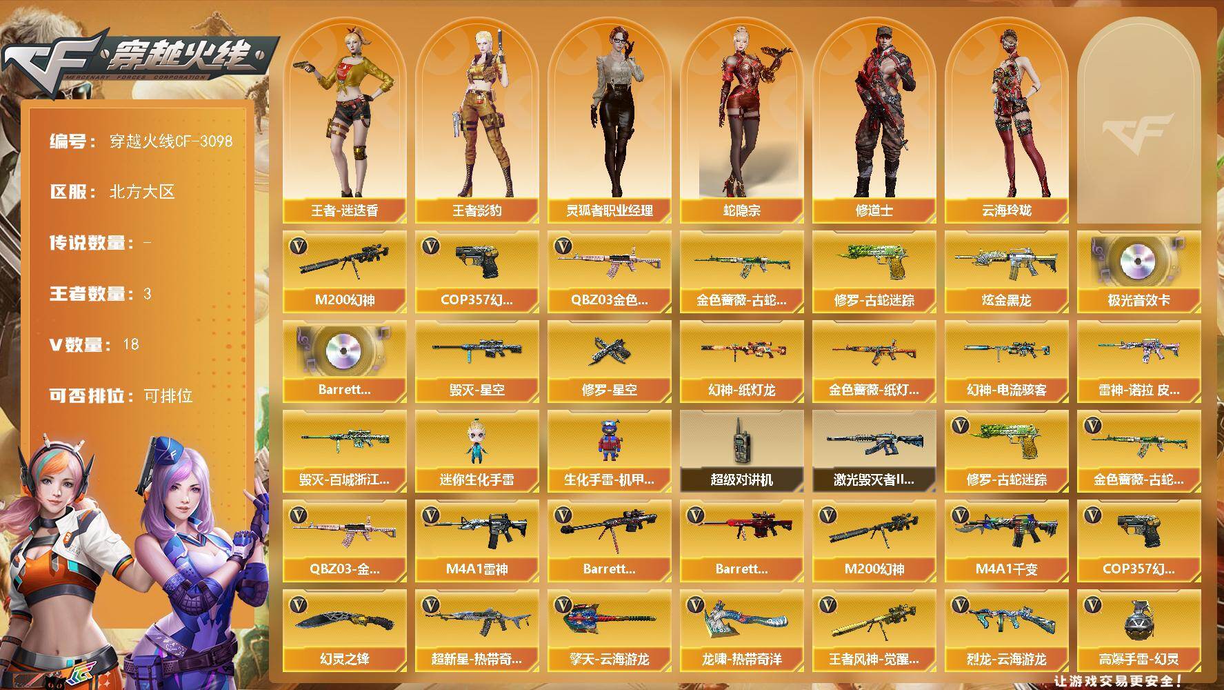[16128912]北方大区-18V-3王者-1炫金 【热门武器】:QBZ03-金色蔷薇,M200-幻神,金色蔷薇-古蛇迷踪,修罗-古蛇迷踪,COP 357-幻灵 【王者炫金武器】:炫金黑龙 【音效卡】:Barrett-极光音效卡,Barrett-碧霄极光音效卡 【皮肤】:幻神-纸灯龙皮肤,幻神-电流骇客 皮肤,金色蔷薇-纸灯龙皮肤,雷神-诺拉 皮肤,毁灭-星空,毁灭-百城浙江 皮肤,修罗-星空 【角色】:蛇隐宗,修道士,云海玲珑,王者影豹,王者-迷迭香,灵狐者-职业经理*2 【人偶武器】:迷你生化手雷,生化手雷-机甲核心 【暴走生化】:斯泰尔-枪娘暗刃,超级对讲机 【挑战大师】:激光毁灭者III-白马银枪 【英雄级武器】:M4A1-千变,M4A1-雷神,超新星-热带奇洋,金色蔷薇-古蛇迷踪,QBZ03-金色蔷薇,Barrett-毁灭,Barrett-极光,M200-幻神,王者风神-觉醒版,烈龙-云海游龙,COP 357-幻灵,修罗-古蛇迷踪,幻灵之锋,擎天-云海游龙,龙啸-热带奇洋,高爆手雷-幻灵,高爆手雷-云龙,手雷-云海游龙,手雷-热带奇洋,高爆手雷-古蛇迷踪,闪光弹-幻灵,闪光弹-云龙,烟雾弹-幻灵,烟雾弹-古蛇迷踪 【特殊枪械】: