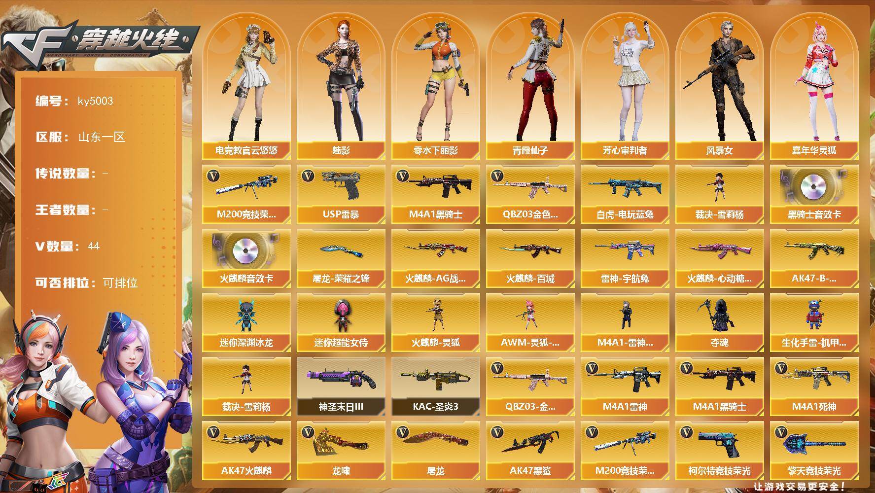 [16067018]山东一区-44V-0王者-0炫金 【热门武器】:QBZ03-金色蔷薇,M200-竞技荣光,白虎-电玩蓝兔,M4A1-黑骑士,裁决-雪莉杨,USP-雷暴 【音效卡】:AK47-火麒麟音效卡,M4A1-黑骑士音效卡 【皮肤】:雷神-宇航兔皮肤,火麒麟-AG战队皮肤,火麒麟-百城,火麒麟-心动糖果,AK47-B-常胜将军-孙权,屠龙-荣耀之锋 【角色】:魅影,电竞教官-云悠悠,芳心审判者,风暴女,嘉年华灵狐,娟娟,零-水下丽影,灵狐者-七夕宝贝,龙儿,龙儿-小淘气,麻雀,曼陀罗-X,潘多拉-X,青霞仙子,斯沃特-X,兔囡囡,樱-战斗天使 【人偶武器】:裁决-雪莉杨,火麒麟-灵狐,M4A1-雷神-精英刀锋,AWM-灵狐-15周年嘉年华,迷你深渊冰龙,夺魂,生化手雷-机甲核心*2,迷你超能女侍 【挑战大师】:KAC-圣炎切割者III,神圣爆裂者-末日III*2 【英雄级武器】:AK47-火麒麟*2,M4A1-雷神*2,M4A1-黑骑士,M4A1-死神,AK47-黑鲨,无影-神兵利器,QBZ03-金色蔷薇,AK-47-猩红传说,黑骑士-海王,白虎-电玩蓝兔,M200-竞技荣光,USP-雷暴,柯尔特-竞技荣光,屠龙*2,龙啸,擎天-竞技荣光*2,高爆手雷-竞技荣光*7,闪光弹-竞技荣光*7,烟雾弹-竞技荣光*7,M4A1-赤狱骑士 【道具】:云山科技背包,背包-洛丽塔,虎牙炫彩背包,救世主-黑桃战神,绿色巨人,灵魂忍者,迷雾幽灵,夺命之镰,防化服*2,金色流光-枪王排位*2,星辰流光-枪王排位,枪王排位28赛季金色流光,枪王排位29赛季金色流光,电玩兔兔表情,EP战队名片,EP战队喷图,防弹头盔*4,防弹衣*3,C4工具钳*2,手雷包*2 【特殊枪械】:1黑骑士