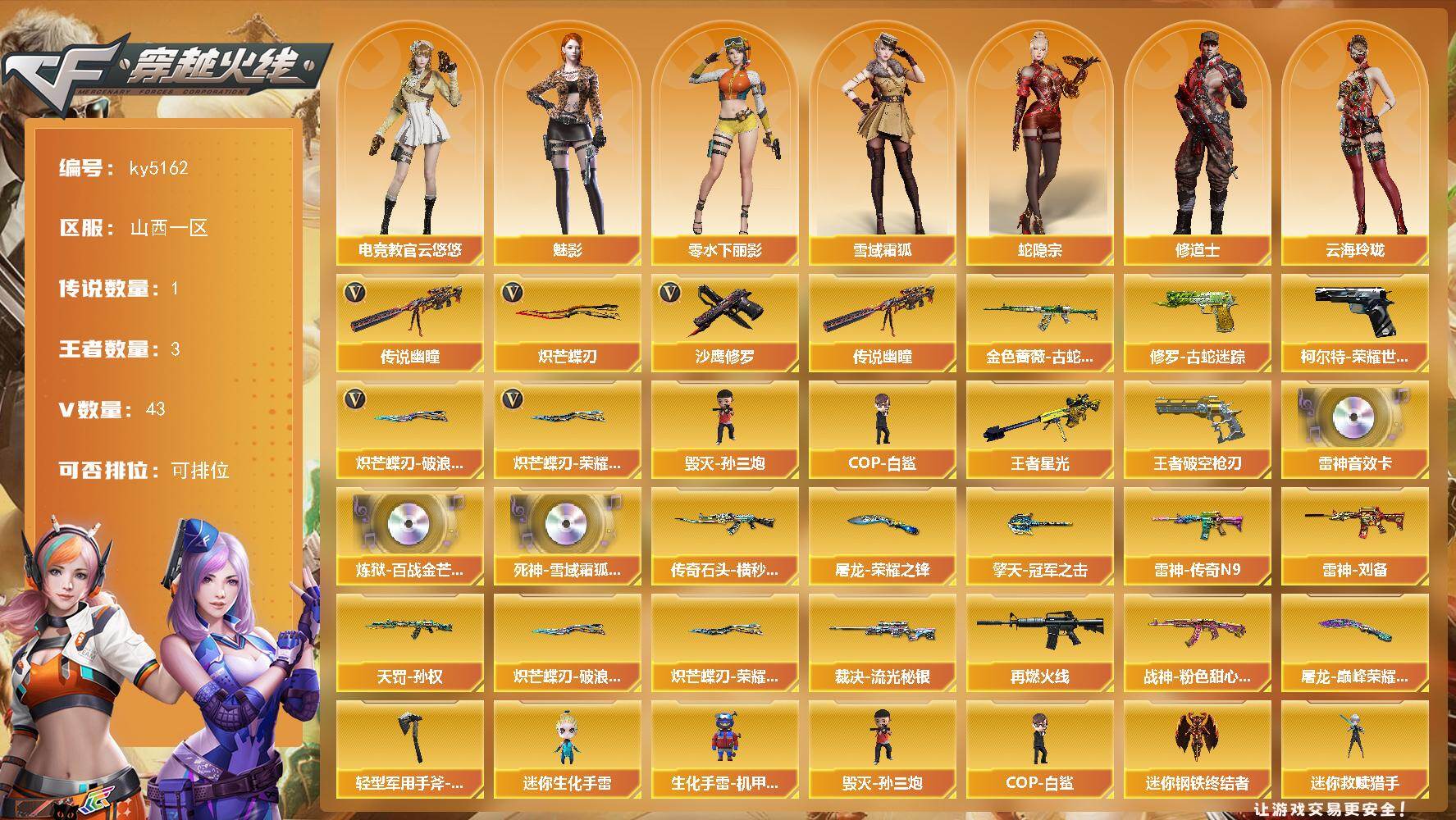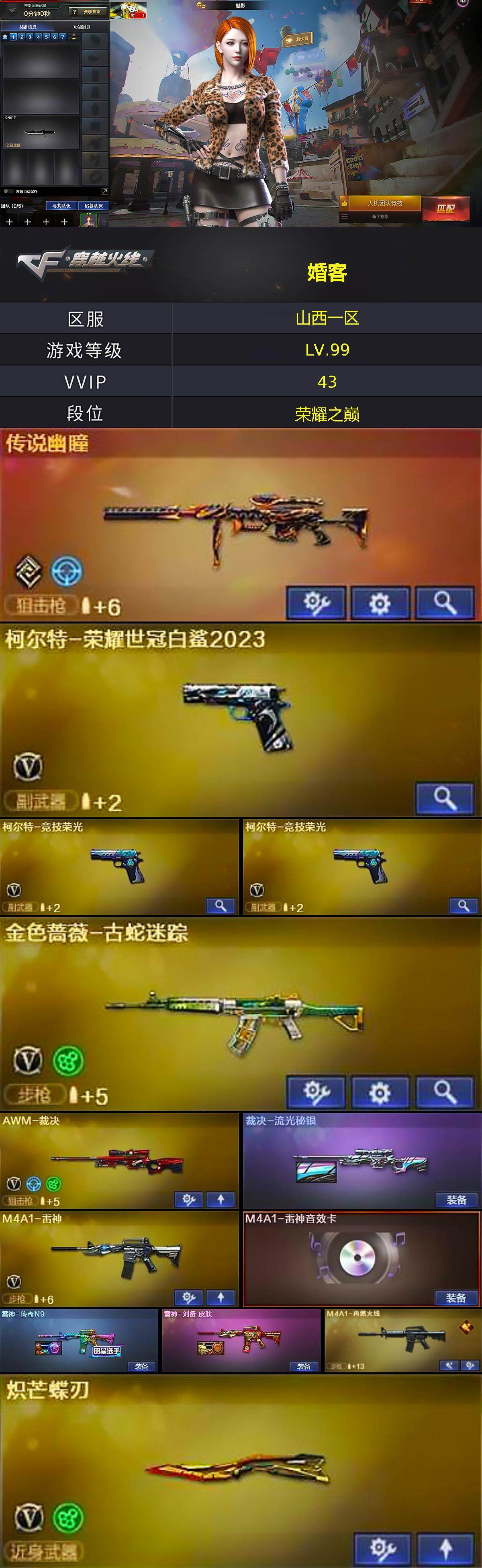 [16068257]山西一区-43V-3王者-0炫金 【传说武器】:传说幽瞳 【热门武器】:传说幽瞳,柯尔特-荣耀世冠白鲨2023,金色蔷薇-古蛇迷踪,修罗-古蛇迷踪,毁灭-孙三炮,COP-白鲨,沙鹰-修罗,炽芒蝶刃,炽芒蝶刃-破浪逐光 皮肤,炽芒蝶刃-荣耀世冠白鲨2023 皮肤 【王者炫金武器】:王者星光,王者破空枪刃 【音效卡】:M4A1-雷神音效卡,炼狱-百战金芒-庆典舞曲音效卡,死神-雪域霜狐-怀旧音效卡 【皮肤】:裁决-流光秘银,雷神-传奇N9,雷神-刘备 皮肤,M4A1-再燃火线,传奇石头-横秒之巅,天罚-孙权 皮肤,战神-粉色甜心皮肤*2,屠龙-荣耀之锋,屠龙-巅峰荣耀 皮肤*2,轻型军用手斧-再燃火线,擎天-冠军之击,炽芒蝶刃-荣耀世冠白鲨2023 皮肤,炽芒蝶刃-破浪逐光 皮肤 【角色】:魅影,电竞教官-云悠悠,雪域霜狐,蛇隐宗,修道士,云海玲珑,暗夜-X,电竞少女,芳心审判者,风暴女,葵-赛博朋克,0号玩家,零-水下丽影,灵狐者-黄金海岸,潘多拉-甜心教官,蛇姬,斯沃特-X,雪莉杨,影武者-X 【人偶武器】:COP-白鲨,毁灭-孙三炮,迷你钢铁终结者,迷你救赎猎手,迷你生化手雷,生化手雷-机甲核心 【暴走生化】:超级对讲机 【挑战大师】:KAC-圣炎切割者III 【英雄级武器】:AK47-火麒麟,M4A1-雷神,AK47-无影,AK12-天启,金色蔷薇-古蛇迷踪,死神-雪域霜狐,王者之圣-觉醒版,AK-47-猩红传说*2,AK47-B-战神*3,黑骑士-海王,AWM-裁决,炼狱-百战金芒,AA-12-雷霆,沙鹰-修罗,沙鹰-天神,柯尔特-荣耀世冠白鲨2023,柯尔特-竞技荣光*2,王者破空枪刃-觉醒版,修罗-古蛇迷踪,屠龙*3,龙啸,擎天,麒麟刺,擎天-竞技荣光,炽芒蝶刃,麒麟刺-百战金芒,高爆手雷-竞技荣光,高爆手雷-古蛇迷踪,闪光弹-竞技荣光,烟雾弹-竞技荣光,烟雾弹-古蛇迷踪,M4A1-赤狱骑士 【道具】:AG战队炫彩背包,CFS限定背包,云山科技背包,亚洲杯纪念炫彩背包,冰冰企鹅背包-猛男专用,古蛇迷踪炫彩背包,百战金芒炫彩背包,超级背包,迷你冰龙背包,雪域霜狐炫彩背包,女皇终结者-魔龙之吻,救世主-黑桃战神,绿色巨人,灵魂忍者*2,变异宝贝,妖姬,迷雾幽灵*2,生化弹匣,夺命之镰,防化服*2,流光-鎏金之域,枪王排位29赛季金色流光,语音特效-盛典烟火,