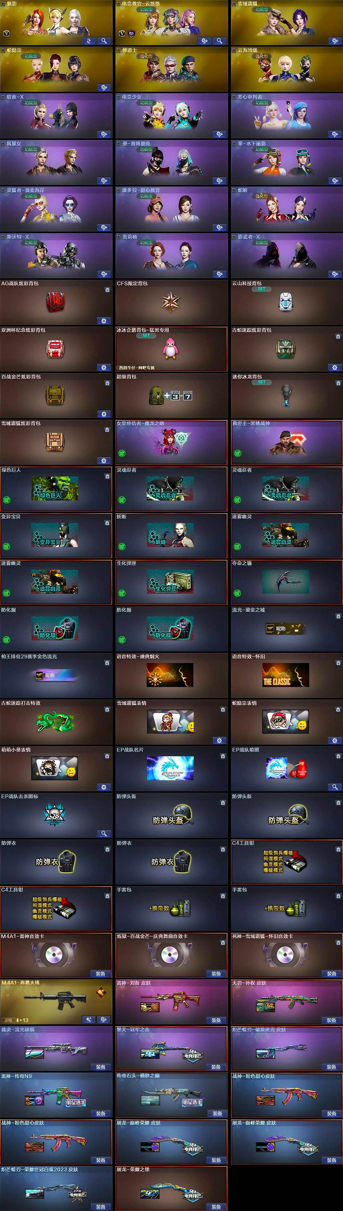 【道具】:AG战队炫彩背包,CFS限定背包,云山科技背包,亚洲杯纪念炫彩背包,冰冰企鹅背包-猛男专用,古蛇迷踪炫彩背包,百战金芒炫彩背包,超级背包,迷你冰龙背包,雪域霜狐炫彩背包,女皇终结者-魔龙之吻,救世主-黑桃战神,绿色巨人,灵魂忍者*2,变异宝贝,妖姬,迷雾幽灵*2,生化弹匣,夺命之镰,防化服*2,流光-鎏金之域,枪王排位29赛季金色流光,语音特效-盛典烟火,