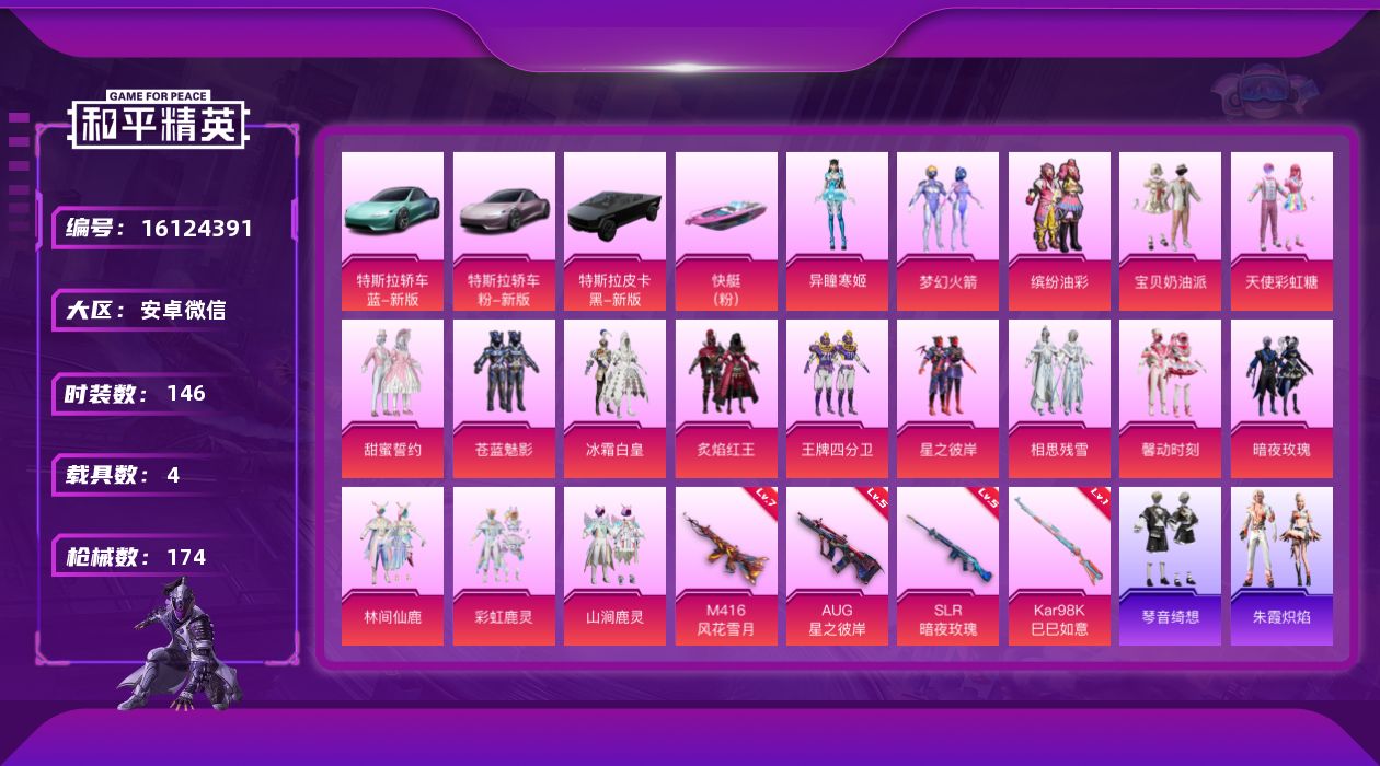 [16124391]【特价出售/店主推荐】 安卓 微信-17粉装-4特效枪-4载具-6粉色飞行器-71994热力值-8王牌印记-146套装-174枪皮 【热门品类】:粉装-梦幻火箭,粉装-缤纷油彩 【粉色套装】:粉装-宝贝奶油派,粉装-天使彩虹糖,粉装-梦幻火箭,粉装-缤纷油彩,粉装-甜蜜誓约,粉装-苍蓝魅影,粉装-冰霜白皇,粉装-炙焰红王,粉装-王牌四分卫,粉装-星之彼岸,粉装-相思残雪,粉装-馨动时刻,粉装-暗夜玫瑰,粉装-林间仙鹿,粉装-彩虹鹿灵,粉装-山涧鹿灵,角色-异瞳寒姬 【粉色枪皮等级】:M416-风花雪月(七级),AUG-星之彼岸(五级),Kar98K-巳巳如意(一级),SLR-暗夜玫瑰(五级) 【粉色载具】:特斯拉Roadster(水滴蓝),特斯拉Roadster(沁心粉),特斯拉Cybertruck(极昼黑),空客H135-蔚蓝之翼,快艇-塞莎KL27(霓虹粉) 【粉色枪皮】:M416-风花雪月,AUG-星之彼岸,Kar98K-巳巳如意,SLR-暗夜玫瑰 【粉色飞行器】:梦幻火箭飞行器,甜蜜誓约飞行器,激战未来飞行器,绮梦青鸾飞行器,星之彼岸飞行器 【粉色降落伞】:甜心宝贝降落伞,梦幻火箭降落伞,甜蜜誓约降落伞,香水柠檬降落伞,暗翼战神降落伞,王牌四分卫降落伞,星之彼岸降落伞,相思残雪降落伞,怪笑疯兔降落伞,葫芦兄弟降落伞,暗夜玫瑰降落伞,林间仙鹿降落伞,海渊国主降落伞,蓝莓炮弹降落伞,炫光之旅降落伞,冷漠罗丽降落伞,炫彩糖果降落伞 【稀有套装】:套装-糖糖葫芦,套装-青团波波,套装-棉花软糖,角色-都市丽猫,套装-燕燕于飞,套装-鱼渊荷华,套装-霓虹热舞,套装-彩虹兔,套装-云朵鹅,套装-雪绒豹,套装-朱霞炽焰,套装-凌霄紫焰,套装-琴音绮想,套装-炫彩糖果 【稀有枪皮】:AKM-彩虹符号,AKM-星之彼岸,AKM-缤纷海域,AKM-萌趣颜团子,AKM-虎虎生威,AKM-龙的传人,M16A4-幻世战舞者,M16A4-甜心亚梦,SCAR-L-夏日绵绵冰,SCAR-L-暗夜玫瑰,SCAR-L-炫彩节奏,SCAR-L-玉兔迎春,SCAR-L-王牌四分卫,SCAR-L-甜蜜誓约,SCAR-L-碧影闪光,GROZA-异彩先驱,GROZA-彩虹符号,GROZA-林间仙鹿,GROZA-治愈之星,AUG-青春冒险家,QBZ-彩虹符号,QBZ-洛神天依,QBZ-电玩视界,QBZ-