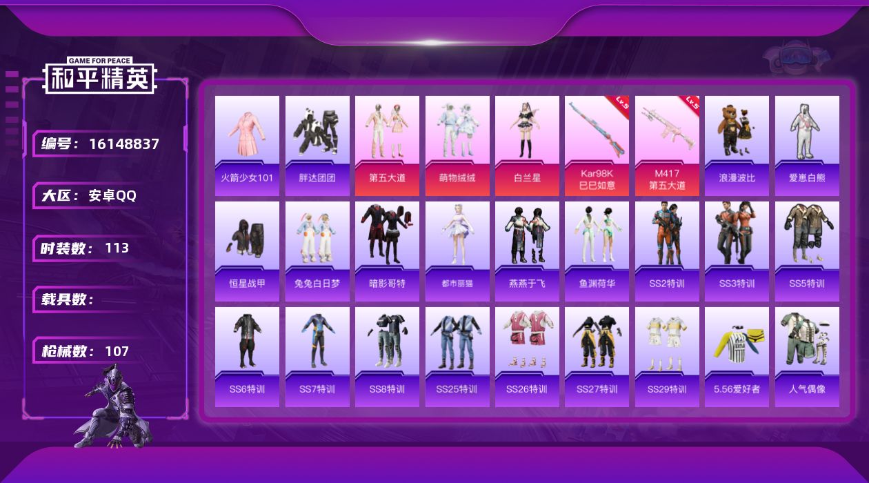 [16148837]老101【特价出售/店主推荐】安卓 手Q-3粉装-2特效枪-0载具-2粉色飞行器-33954热力值-3王牌印记-113套装-107枪皮【热门品类】:套装-火箭少女101,套装-胖达团团,套装-SS1特训,套装-暗影哥特,套装-浪漫波比【粉色套装】:粉装-第五大道,粉装-萌物绒绒,角色-白兰星【粉色枪皮等级】:Kar98K-巳巳如意(五级),M417-第五大道(五级)【粉色枪皮】:Kar98K-巳巳如意,M417-第五大道【粉色飞行器】:萌物绒绒飞行器,镜域双华-灵镜之阶