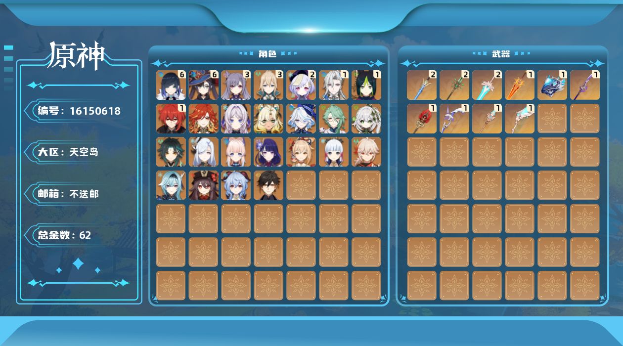 0命芙宁娜,1命那维莱特,0命白术,0命纳西妲,1命提纳里,满命夜兰,0命申鹤,0命优菈,0命雷电将军,0命枫原万叶,0命神里绫华,0命钟离,0命胡桃,0命甘雨,0命魈,0命宵宫,0命珊瑚宫心海,3命刻晴,2命七七,3命琴,满命莫娜,1命迪卢克,0命希诺宁,0命玛薇卡,0命茜特菈莉,精1万世流涌大典,精1薙草之稻光,精2苍古自由之誓,精1护摩之杖,精2和璞鸢,精1天空之脊,精1天空之翼,精1阿莫斯之弓,精2天空之傲,精1焚曜千阳