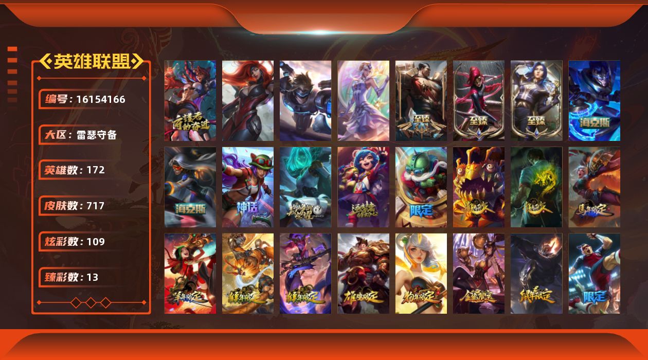 白银段位-172英雄-717皮肤-109炫彩-4终极-8神话-126限定-72传说-159史诗