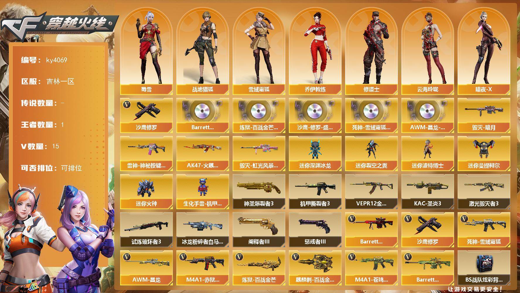 [16157052]吉林一区-15V-1王者-0炫金 【热门武器】:沙鹰-修罗 【音效卡】:Barrett-碧霄极光音效卡*4,炼狱-百战金芒-庆典舞曲音效卡,沙鹰-修罗-盛典舞曲音效卡,死神-雪域霜狐-怀旧音效卡,AWM-昌龙-怀旧音效卡 【皮肤】:雷神-神秘按键 皮肤,AK47-火麒麟-百城23冠军皮肤,毁灭-暗月,毁灭-虹光风暴 皮肤 【角色】:战地猎狐,雪域霜狐,乔伊教练,修道士,云海玲珑,暗夜-X,芳心审判者,潘多拉-甜心教官,斯沃特-X,蜀雪,铁骑-乘风破浪,雪莉杨-摸金校尉 【人偶武器】:迷你深渊冰龙*2,迷你裂空之翼,迷你波特博士,迷你曼提柯尔,迷你火种,生化手雷-机甲核心 【挑战大师】:神圣爆裂者III,冰龙粉碎者-白马银枪,VEPR-12-金魔,激光毁灭者III,机甲撕裂者III,试炼破坏者III,KAC-圣炎切割者III,阐释者III*2,惩戒者III 【英雄级武器】:死神-雪域霜狐,Barrett-极光,炼狱-百战金芒,沙鹰-修罗,麒麟刺-百战金芒,M4A1-赤狱骑士,M4A1-苍鸣雷神,AWM-昌龙,Barrett-碧霄极光*2 【道具】:BS战队炫彩背包,CFS限定背包,云山科技背包,亚洲杯纪念炫彩背包,女皇终结者-背包,炫彩背包-诺拉,炫彩背包,百战金芒炫彩背包,背包-洛丽塔,超级背包,金狐背包,雪域霜狐炫彩背包,黑桃战神背包,女皇终结者-魔龙之吻,救世主-黑桃战神,黄金生化钩,绿色巨人,灵魂忍者*2,妖姬,迷雾幽灵,夺命之镰,防化服*3,流光-鎏金之域,流光-再燃火线,枪王排位29赛季金色流光,语音特效-盛典烟火,语音特效-怀旧,雪域霜狐表情,萌萌小葵表情,电玩兔兔表情,炽雪表情,动感闪耀表情,C4-再燃火线,防弹头盔*3,防弹衣*3,C4工具钳*3,手雷包*3 【特殊枪械】: