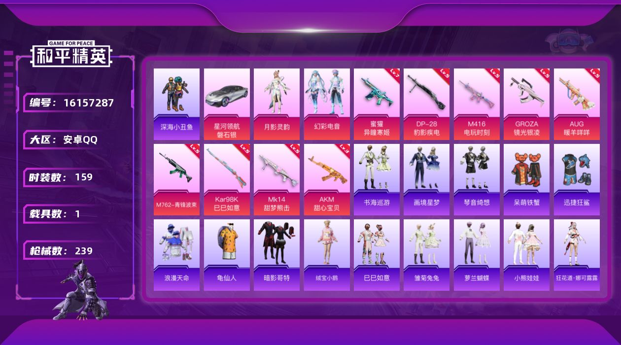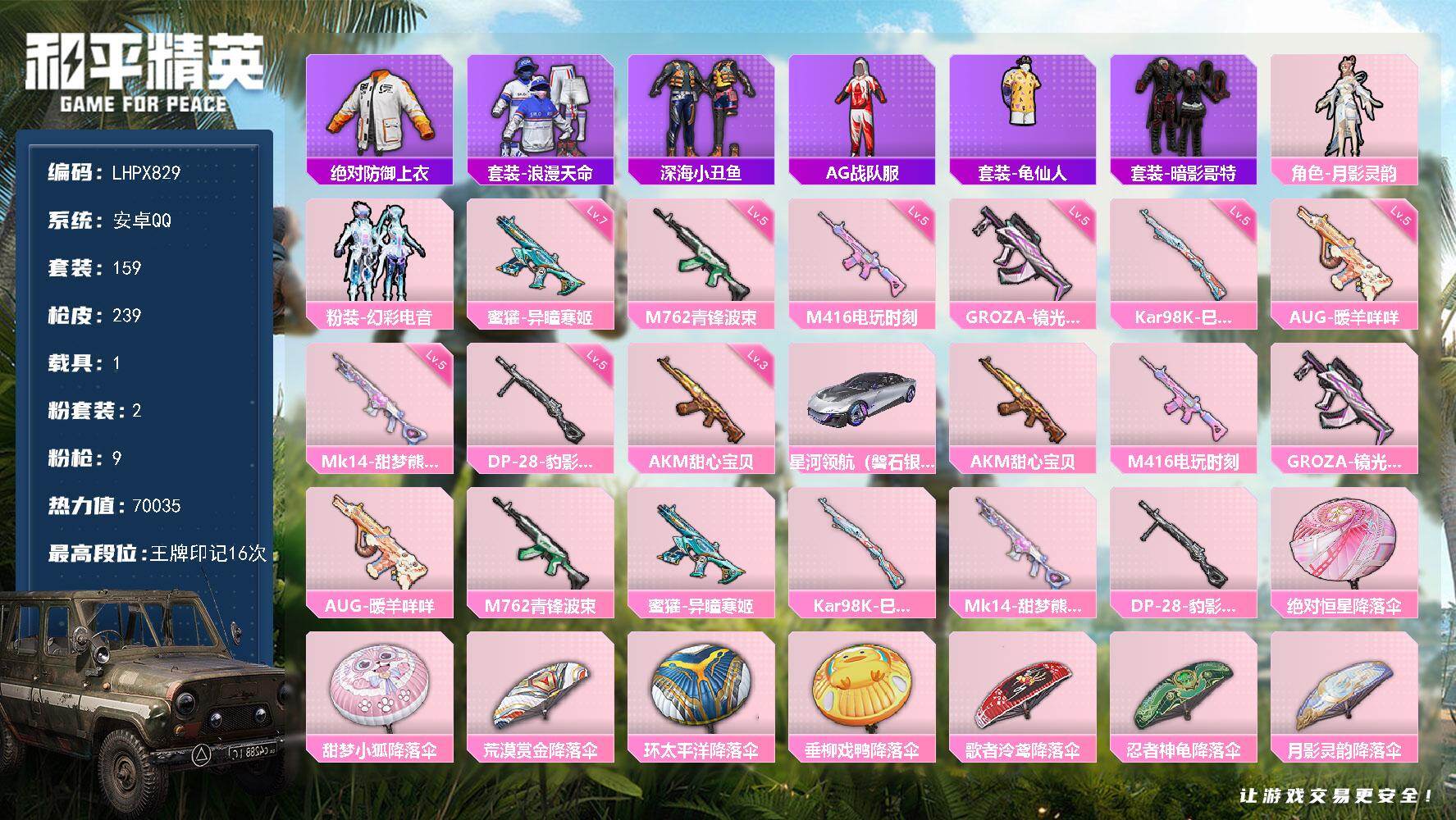 [16157287]【特价出售/店主推荐】 安卓 手Q-2粉装-9特效枪-1载具-1粉色飞行器-70035热力值-16王牌印记-159套装-239枪皮【热门品类】:绝对防御上衣,套装-浪漫天命,套装-深海小丑鱼,套装-AG战队服,套装-龟仙人,套装-暗影哥特【粉色套装】:角色-月影灵韵,粉装-幻彩电音【粉色枪皮等级】:AKM-甜心宝贝(三级),M416-电玩时刻(五级),GROZA-镜光银凌(五级),AUG-暖羊咩咩(五级),M762-青锋波束(五级),蜜獾-异瞳寒姬(七级),Kar98K-巳巳如意(五级),Mk14-甜梦熊击(五级),DP-28-豹影疾电(五级)【粉色载具】:星河领航(磐石银)【粉色枪皮】:AKM-甜心宝贝,M416-电玩时刻,GROZA-镜光银凌,AUG-暖羊咩咩,M762-青锋波束,蜜獾-异瞳寒姬,Kar98K-巳巳如意,Mk14-甜梦熊击,DP-28-豹影疾电