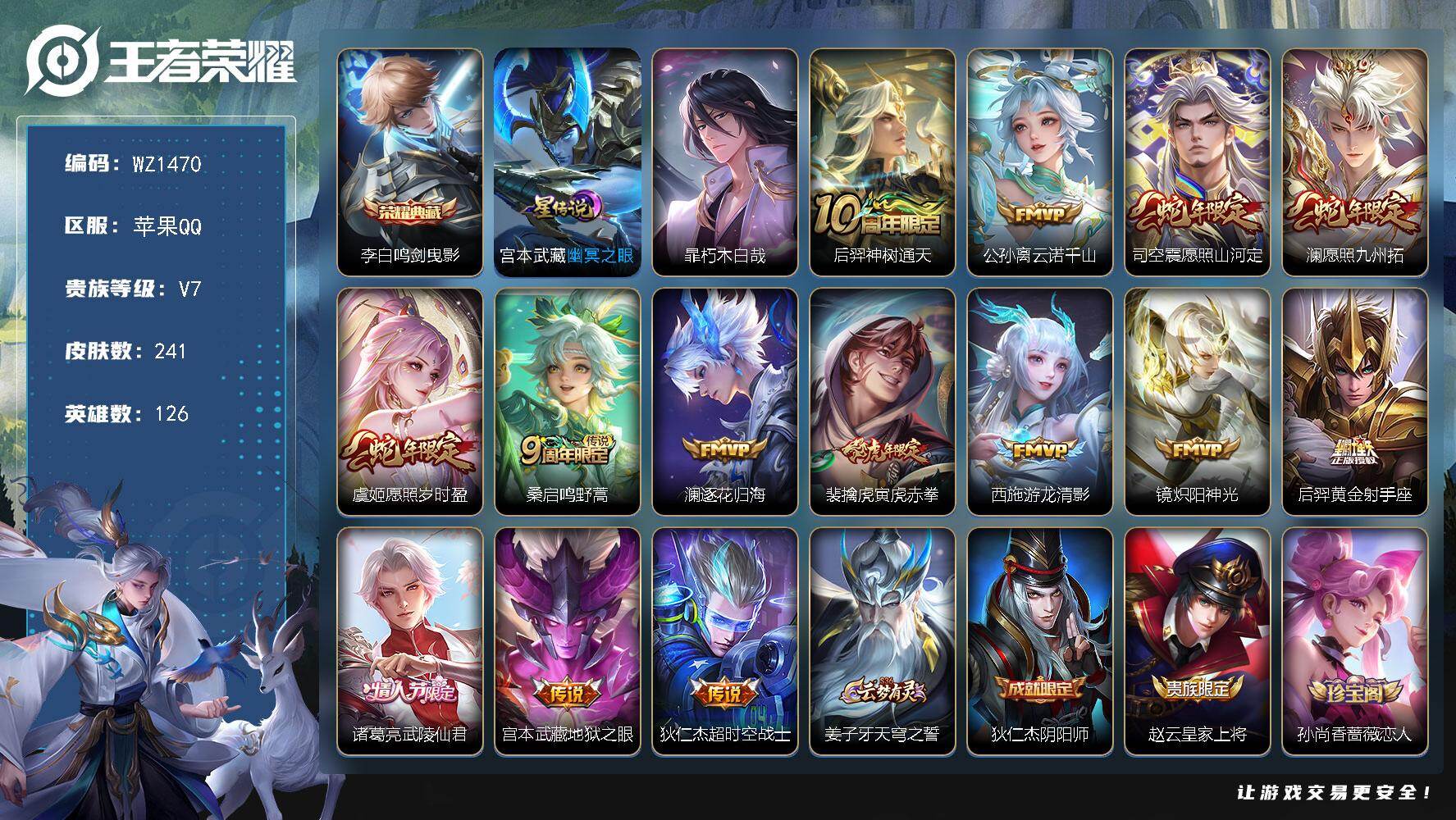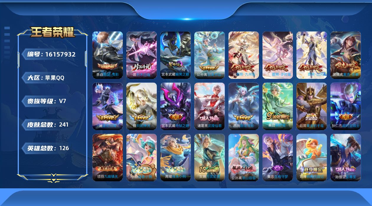 [16157932]苹果Q--241皮肤-1典藏皮肤-1珍品传说-14传说-63史诗 【英雄全皮】:孙权全皮,鬼谷子全皮,影全皮 【荣耀典藏】:李白鸣剑曳影 【珍品传说】:暃朽木白哉 【传说皮肤】:后羿神树通天,公孙离云诺千山,司空震愿照山河定,澜愿照九州拓,虞姬愿照岁时盈,桑启鸣野蒿,澜逐花归海,裴擒虎寅虎赤拳,西施游龙清影,镜炽阳神光,后羿黄金射手座,诸葛亮武陵仙君,宫本武藏地狱之眼,狄仁杰超时空战士 【限定皮肤】:姜子牙天穹之誓,狄仁杰阴阳师,赵云皇家上将,孙尚香蔷薇恋人,高渐离玩趣恶龙,元歌云间偶戏,元歌无心,夏侯惇朔风刀,马可波罗暗影游猎,马可波罗山海玄木吟,狄仁杰魔术师,狄仁杰万华元夜,达摩星际陆战队,达摩沙漠行僧,项羽海滩派对,老夫子醍醐杖,程咬金演武夺筹,兰陵王金庭之子,亚瑟潮玩骑士王,孙悟空至尊宝,李元芳云中旅人,钟馗驱傩正仪,雅典娜黎明之约,鬼谷子原初探秘者,鬼谷子五谷丰年,诸葛亮武陵仙君,苏烈千军破阵,百里玄策原初追逐者,弈星混沌棋,梦奇顽趣,沈梦溪大漠名商,明世隐疑决卦,裴擒虎李小龙,裴擒虎寅虎赤拳,米莱狄胡桃异想国,云中君纤云弄巧,鲁班大师探海日志,桑启海盐诗旅,张良古海寻踪,蒙犽百解令,蒙恬荣光圣徽,鬼谷子天穹祈灯,沈梦溪龙舞盛年,刘邦剑破天穹,周瑜熔金海岸 【年限皮肤】:裴擒虎寅虎赤拳,马可波罗山海玄木吟,司空震愿照山河定,澜愿照九州拓,虞姬愿照岁时盈 【赛季限定】:夏侯惇朔风刀,弈星混沌棋,明世隐疑决卦,老夫子醍醐杖,鬼谷子原初探秘者,狄仁杰万华元夜,程咬金演武夺筹,钟馗驱傩正仪,苏烈千军破阵,达摩沙漠行僧,兰陵王金庭之子,沈梦溪大漠名商,李元芳云中旅人,桑启海盐诗旅,鲁班大师探海日志,张良古海寻踪,鬼谷子天穹祈灯,刘邦剑破天穹,姜子牙天穹之誓,东皇太一噬灭天穹,太乙真人谧流熔炉,钟馗虚灵犬护,甄姬逆浪荇歌,亚瑟荣光之誓,百里玄策原初追逐者,雅典娜黎明之约,梦奇顽趣,蒙恬荣光圣徽,牛魔星界战将,项羽九幽镇关 【战令限定】:马可波罗暗影游猎,元歌云间偶戏,亚瑟潮玩骑士王,米莱狄胡桃异想国,达摩星际陆战队,亚连破空之剑,孙悟空神迹守卫,百里守约百相守梦,老夫子百相守梦,孙膑茶境仙,马超访茗客,刘禅鸭鸭历险记,沈梦溪鸭鸭历险记,周瑜线条小狗,小乔线条小狗 【史诗皮肤】:项羽苍穹之光,赵云皇家上将,貂蝉圣诞恋歌,甄姬冰雪圆舞曲,狄仁杰魔术师,宫本武藏鬼剑武藏,