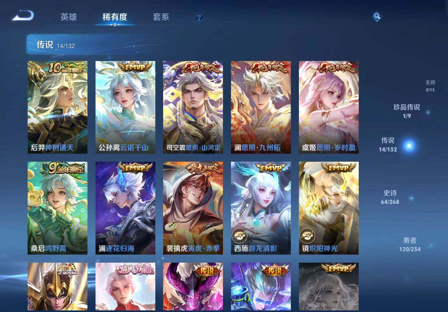 【传说皮肤】:后羿神树通天,公孙离云诺千山,司空震愿照山河定,澜愿照九州拓,虞姬愿照岁时盈,桑启鸣野蒿,澜逐花归海,裴擒虎寅虎赤拳,西施游龙清影,镜炽阳神光,后羿黄金射手座,诸葛亮武陵仙君,宫本武藏地狱之眼,狄仁杰超时空战士