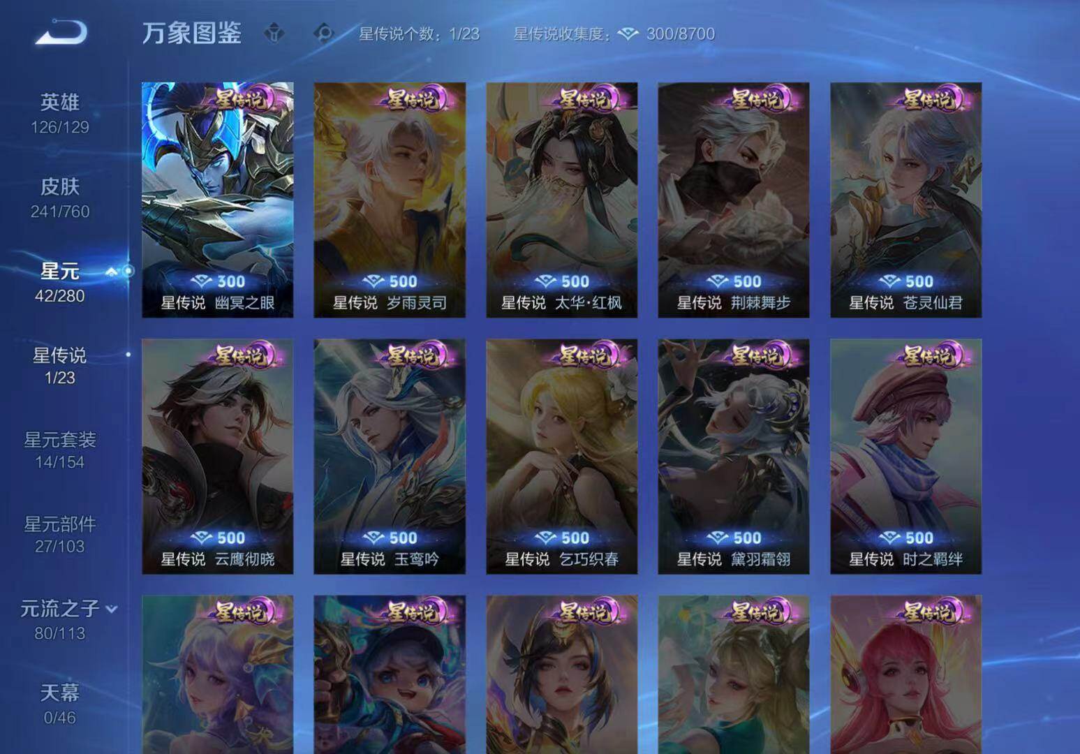夏侯惇朔风刀,明世隐疑决卦,老夫子醍醐杖,鬼谷子原初探秘者,狄仁杰万华元夜,程咬金演武夺筹,钟馗驱傩正仪,苏烈千军破阵,马可波罗暗影游猎,元歌云间偶戏,弈星混沌棋,达摩沙漠行僧,兰陵王金庭之子,沈梦溪大漠名商,李元芳云中旅人,桑启海盐诗旅,鲁班大师探海日志,张良古海寻踪