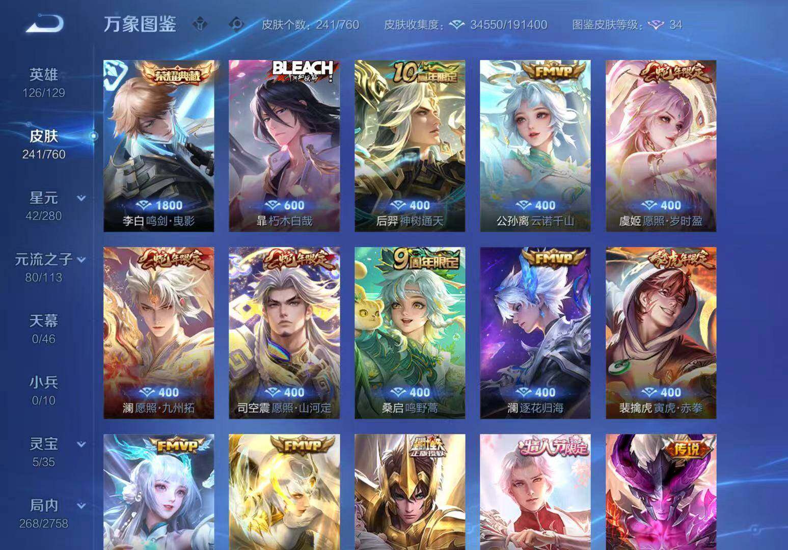 【限定皮肤】:姜子牙天穹之誓,狄仁杰阴阳师,赵云皇家上将,孙尚香蔷薇恋人,高渐离玩趣恶龙,元歌云间偶戏,元歌无心,夏侯惇朔风刀,马可波罗暗影游猎,马可波罗山海玄木吟,狄仁杰魔术师,狄仁杰万华元夜,达摩星际陆战队,达摩沙漠行僧,项羽海滩派对,老夫子醍醐杖,程咬金演武夺筹,兰陵王金庭之子,亚瑟潮玩骑士王,孙悟空至尊宝,李元芳云中旅人,钟馗驱傩正仪,雅典娜黎明之约,鬼谷子原初探秘者,鬼谷子五谷丰年,诸葛亮武陵仙君,苏烈千军破阵,百里玄策原初追逐者,弈星混沌棋,梦奇顽趣,沈梦溪大漠名商,明世隐疑决卦,裴擒虎李小龙,裴擒虎寅虎赤拳,米莱狄胡桃异想国,云中君纤云弄巧,鲁班大师探海日志,桑启海盐诗旅,张良古海寻踪,蒙犽百解令,蒙恬荣光圣徽,鬼谷子天穹祈灯,沈梦溪龙舞盛年,刘邦剑破天穹,周瑜熔金海岸