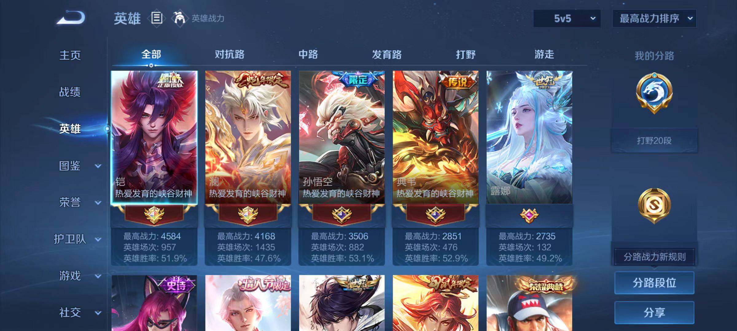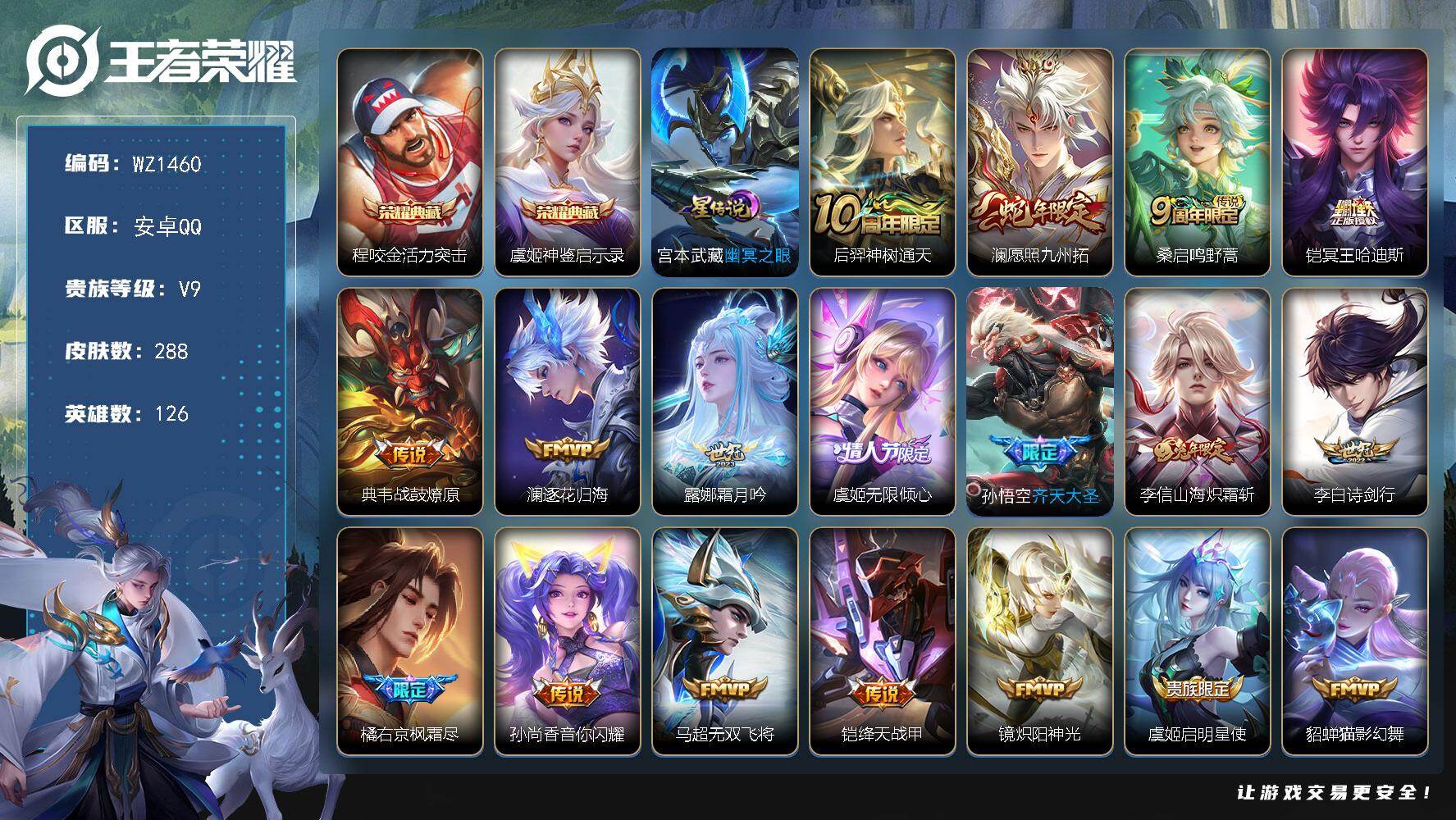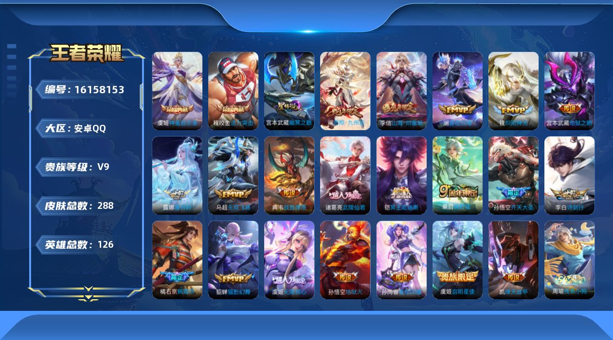 [16158153]安卓Q-V9-永恒钻石III段位-126英雄-288皮肤-2典藏皮肤-21传说-61史诗
