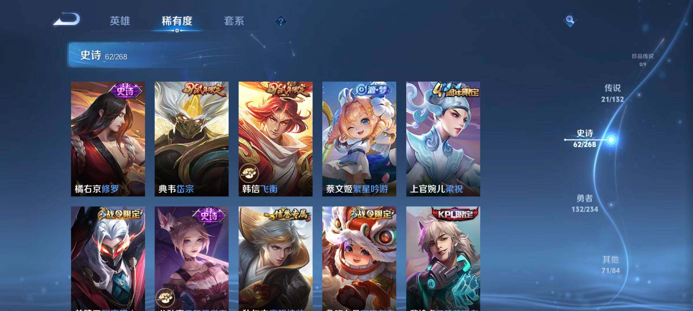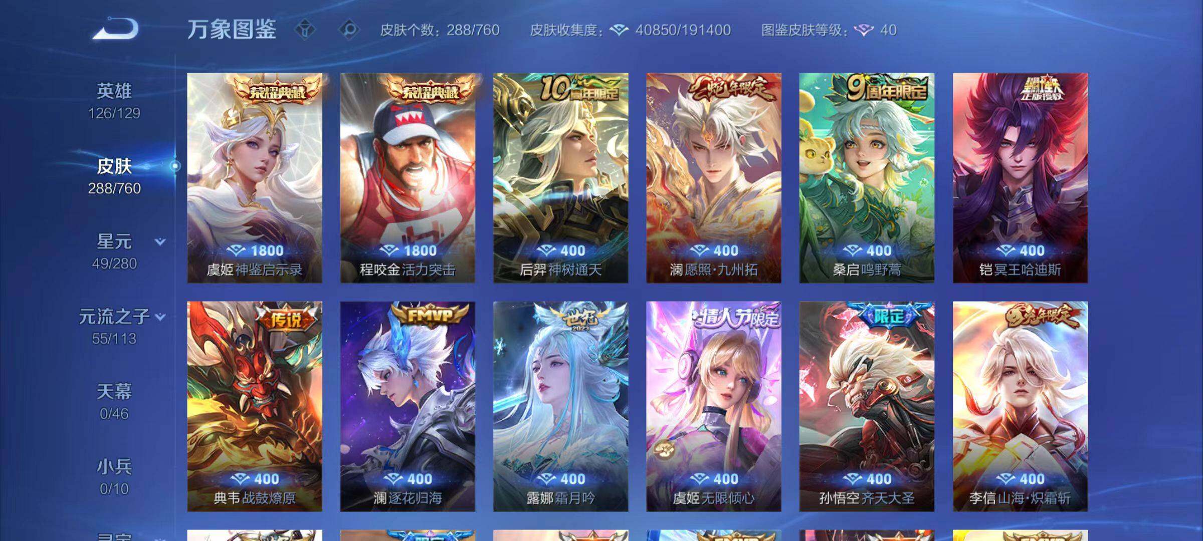 【限定皮肤】:铠冥王哈迪斯,蔡文姬夏日便利店,大乔绒语心约,虞姬夏日便利店,姜子牙天穹之誓,狄仁杰阴阳师,赵云皇家上将,孙尚香蔷薇恋人,鲁班七号狮舞东方,高渐离玩趣恶龙,吕布猎兽之王,周瑜赤莲之焰,夏侯惇朔风刀,典韦蓝屏警告,典韦岱宗,马可波罗暗影游猎,狄仁杰魔术师,达摩沙漠行僧,项羽海滩派对,老夫子醍醐杖,程咬金演武夺筹,韩信飞衡,兰陵王驯魔猎人,兰陵王金庭之子,花木兰青春决赛季,橘右京枫霜尽,孙悟空大圣娶亲,孙悟空孙行者,孙悟空齐天大圣,牛魔御旌,李元芳匿光侦查者,李元芳云中旅人,虞姬霸王别姬,虞姬启明星使,虞姬无限倾心,钟馗神迹守卫,钟馗驱傩正仪,女娲朔望之晖,蔡文姬繁星吟游,鬼谷子原初探秘者,鬼谷子五谷丰年,诸葛亮武陵仙君,苏烈千军破阵,沈梦溪大漠名商,裴擒虎天狼狩猎者,裴擒虎李小龙,米莱狄御霄,云中君纤云弄巧,李信山海炽霜斩,盾山御銮,猪八戒西部大镖客,上官婉儿梁祝,西施玲珑珍味,鲁班大师探海日志,镜匿光追影者,桑启海盐诗旅,艾琳流音漫舞,司空震地狱燃心,阿古朵江河有灵,张良古海寻踪,鬼谷子天穹祈灯,沈梦溪龙舞盛年,李元芳蔬乡物语,周瑜熔金海岸
