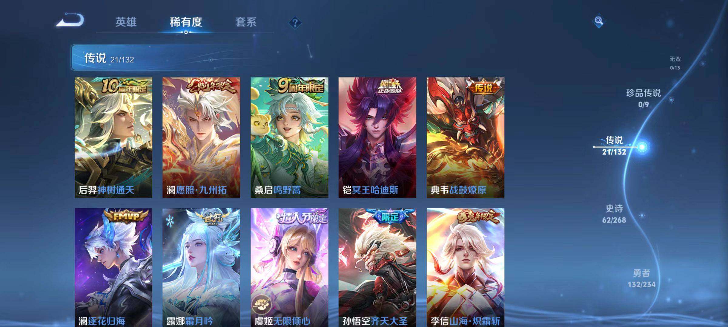 【传说皮肤】:后羿神树通天,澜愿照九州拓,桑启鸣野蒿,铠冥王哈迪斯,典韦战鼓燎原,澜逐花归海,露娜霜月吟,虞姬无限倾心,孙悟空齐天大圣,李信山海炽霜斩,李白诗剑行,橘右京枫霜尽,孙尚香音你闪耀,马超无双飞将,铠绛天战甲,镜炽阳神光,虞姬启明星使,貂蝉猫影幻舞,诸葛亮武陵仙君,宫本武藏地狱之眼,孙悟空地狱火