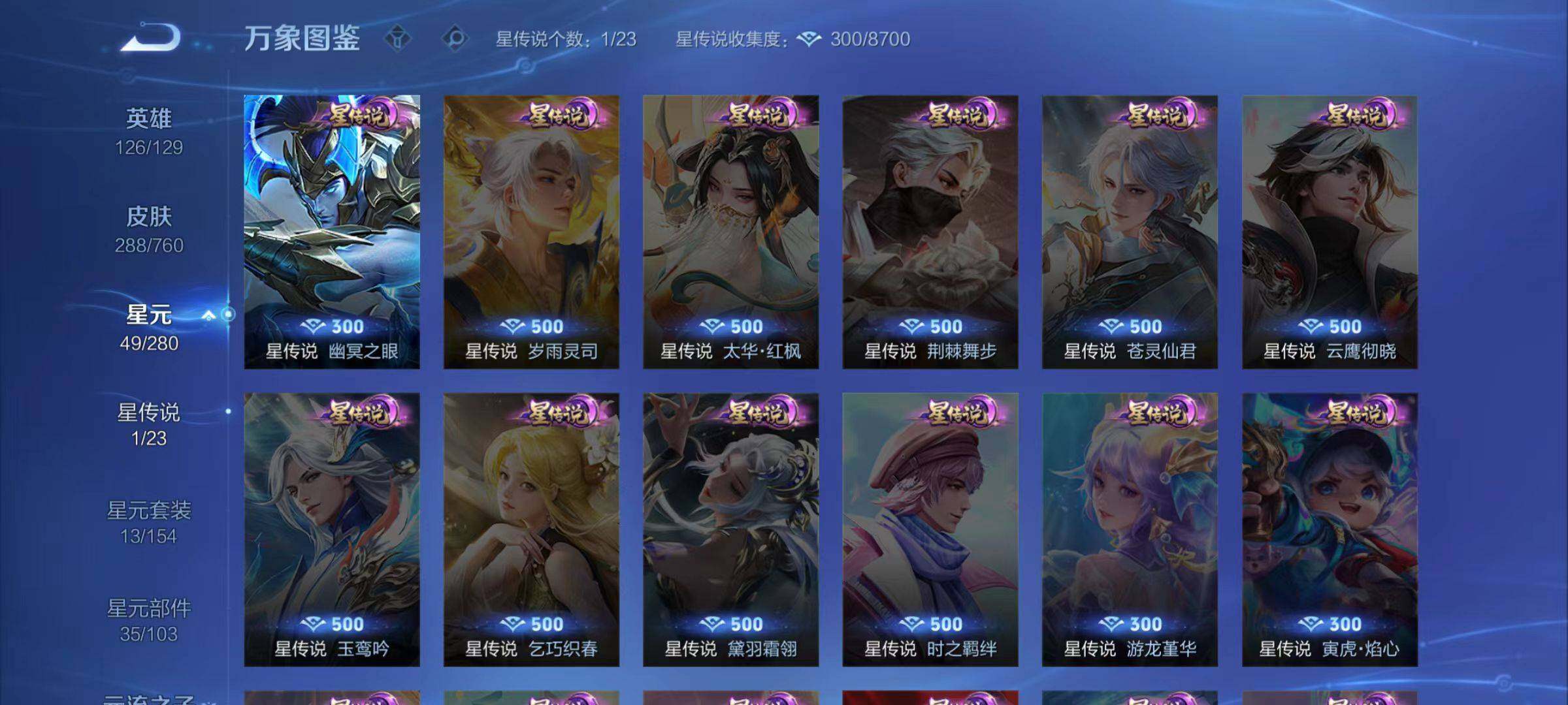 裴擒虎李小龙,上官婉儿梁祝,马超神威,典韦岱宗,韩信飞衡,裴擒虎天狼狩猎者,虞姬霸王别姬,孙悟空大圣娶亲,花木兰青春决赛季,孙悟空孙行者,镜匿光追影者,橘右京枫霜尽,李白诗剑行,桑启鸣野蒿,澜愿照·九州拓