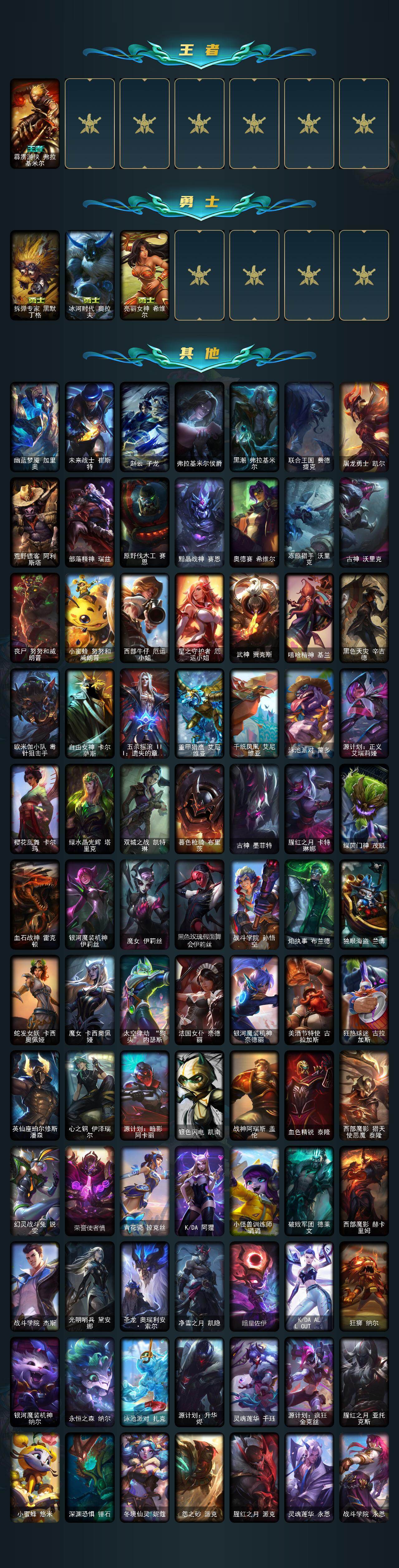 【其他皮肤1】:幽蓝梦魇加里奥,未来战士崔斯特,赵云子龙,弗拉基米尔侯爵,黑潮弗拉基米尔,联合王国费德提克,屠龙勇士凯尔,荒野镖客阿利斯塔,部落精神瑞兹,原野伐木工赛恩,黯晶战神赛恩,奥德赛希维尔,冻原猎手沃里克,古神沃里克,丧尸