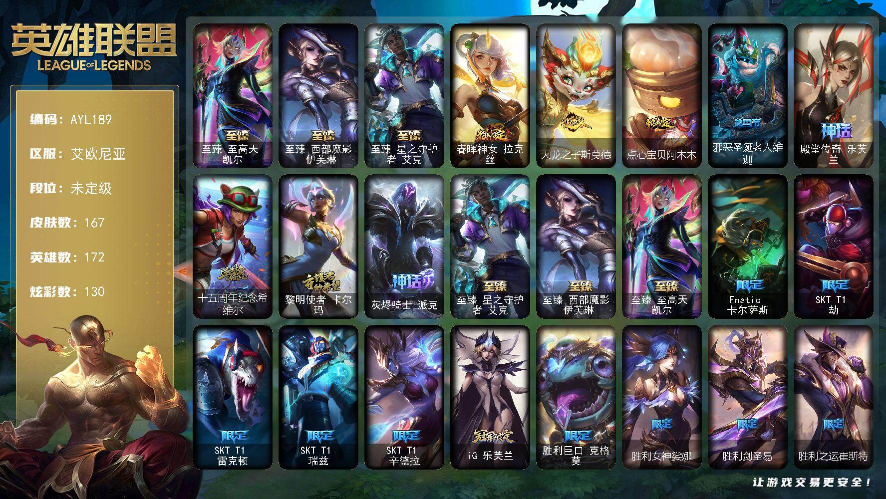 [16160166]【店主推荐捡漏号】未定级段位-172英雄-167皮肤-130炫彩-0终极-7神话-24限定-20传说-28史诗 【至臻皮肤】:至臻至高天凯尔,至臻西部魔影伊芙琳,至臻星之守护者艾克 【臻彩皮肤】:冠军掠夺者卡兹克凯旋圣装,战斗学院卡特琳娜盛典礼服,可爱可爱粉红红布里茨,殿堂传奇乐芙兰登神,魔女阿卡丽虚荣 【年限皮肤】:春晖神女拉克丝,天龙之子斯莫德,点心宝贝阿木木 【冰雪限定】:邪恶圣诞老人维迦 【神话皮肤】:殿堂传奇乐芙兰,十五周年纪念希维尔,黎明使者卡尔玛,灰烬骑士派克,至臻西部魔影伊芙琳,至臻至高天凯尔,至臻星之守护者艾克 【限定皮肤】:Fnatic卡尔萨斯,SKTT1劫,SKTT1雷克顿,SKTT1瑞兹,SKTT1辛德拉,iG乐芙兰,胜利巨口克格莫,胜利女神娑娜,胜利剑圣易,胜利之运崔斯特,南瓜头王子阿木木,鬼影重重魔腾,小恶魔菲兹,无头骑士赫卡里姆,暗影沃里克,野兽猎人瑟庄妮,波比的巧克力工坊,都铎王朝图奇,双城之战2微光实验室辛吉德,双城之战2救世主维克托 【传说皮肤】:地狱之门卫士加里奥,大天使长米迦勒凯尔,约德尔国队长提莫,烈焰雄心崔丝塔娜,合金巨兽努努和威朗普,绅士科加斯,冰霜之刃艾瑞莉娅,最终BOSS维迦,冰川巨兽墨菲特,光明哨兵薇恩,枯萎之壤泽拉斯,黯黑魔龙希瓦娜,焰尾妖狐阿狸,霸天异形卡兹克,神王德莱厄斯,奥德赛凯隐,神龙尊者夜月幻龙亚索,天煞劫,真实伤害艾克,源计划毁灭派克 【史诗皮肤】:屠龙勇士赵信,重生之沙费德提克,天人合一易,熊猫提莫,刀锋女王莫甘娜,五杀摇滚键盘手娑娜,掠星魔刃卡萨丁,恐惧新星普朗克,霸天巨兽墨菲特,屠龙勇士薇恩,血色精锐锐雯,帝王斑蝶克格莫,深海怪鱼克格莫,黑帮教父格雷福斯,银河魔装机神菲兹,铁血猎人雷恩加尔,驯龙女巫璐璐,绞肉机刽子手德莱文,永恒之森赫卡里姆,勇敢的心奎因,野火之藤婕拉,弗雷尔卓德塔莉垭,源代码卡蜜尔,猛虎布隆,源计划自由艾克,霸天剑魔亚托克斯,糖果之王艾翁,冰雪游神巴德 【王者皮肤】:霹雳游侠弗拉基米尔 【勇士皮肤】:拆弹专家黑默丁格,冰河时代奥拉夫,亮丽女神希维尔 【其他皮肤1】:幽蓝梦魇加里奥,未来战士崔斯特,赵云子龙,弗拉基米尔侯爵,黑潮弗拉基米尔,联合王国费德提克,屠龙勇士凯尔,荒野镖客阿利斯塔,部落精神瑞兹,原野伐木工赛恩,黯晶战神赛恩,奥德赛希维尔,冻原猎手沃里克,古神沃里克,丧尸