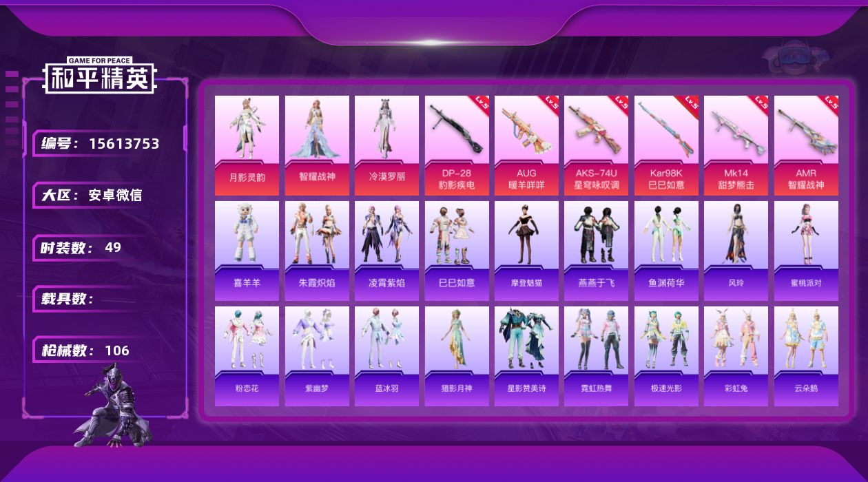 [15613753]社交限制-介意勿拍-安卓 微信-3粉装-6特效枪-0载具-1粉色飞行器-28355热力值-2王牌印记-49套装-106枪皮