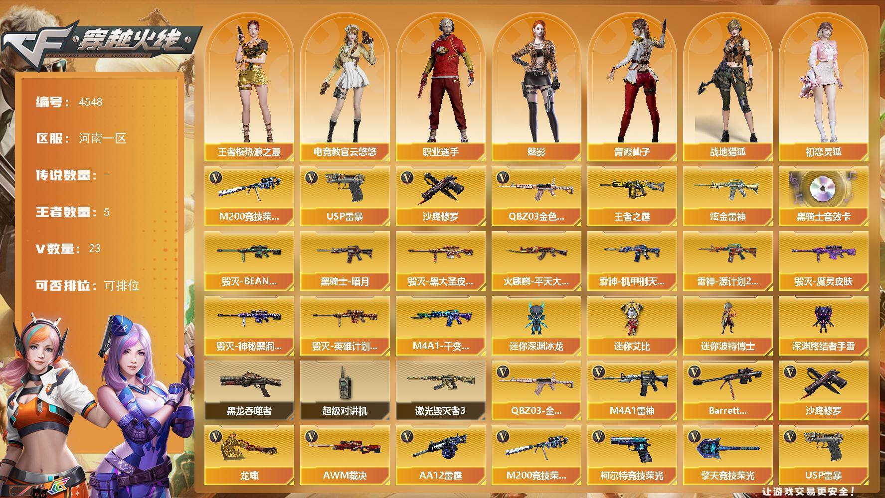[16163682]河南一区-23V-5王者-1炫金 【热门武器】:QBZ03-金色蔷薇,M200-竞技荣光,USP-雷暴,沙鹰-修罗 【王者炫金武器】:王者之霆,炫金雷神 【音效卡】:M4A1-黑骑士音效卡 【皮肤】:雷神-机甲刑天皮肤,雷神-源计划2.0专属 皮肤,火麒麟-平天大圣,毁灭-BEAN-2020MVP,毁灭-黑大圣皮肤,毁灭-魔灵皮肤,毁灭-神秘黑洞皮肤,毁灭-英雄计划 皮肤,M4A1-千变-孔明皮肤,黑骑士-暗月 【角色】:魅影,电竞教官-云悠悠,战地猎狐,王者樱-热浪之夏,初恋灵狐,芳心审判者,飞虎队-X,风暴女,虎妞,灵狐者-X,潘多拉-X,潘多拉-甜心教官,潜龙队-X,青霞仙子,新娜塔莎,樱-战斗天使,职业选手 【人偶武器】:迷你深渊冰龙,迷你波特博士,深渊终结者手雷,迷你艾比 【暴走生化】:黑龙吞噬者,超级对讲机 【挑战大师】:激光毁灭者III 【英雄级武器】:M4A1-雷神,黑武士-锦绣游龙,QBZ03-金色蔷薇,王者之影-觉醒版,王者风势-觉醒版,Barrett-毁灭,AWM-裁决,M200-竞技荣光,AA-12-雷霆,沙鹰-修罗,USP-雷暴,柯尔特-竞技荣光,龙啸,擎天-竞技荣光,王者之锋-觉醒版*2,高爆手雷-竞技荣光,高爆手雷-云龙,闪光弹-竞技荣光,烟雾弹-竞技荣光,M4A1-赤狱骑士 【道具】:超级背包,救世主-黑桃战神,绿色巨人,灵魂忍者,迷雾幽灵,夺命之镰,防化服*2,星辰流光-枪王排位,枪王排位28赛季金色流光,枪王排位29赛季金色流光,防弹头盔*5,防弹衣*5,C4工具钳*5,手雷包*5 【特殊枪械】:
