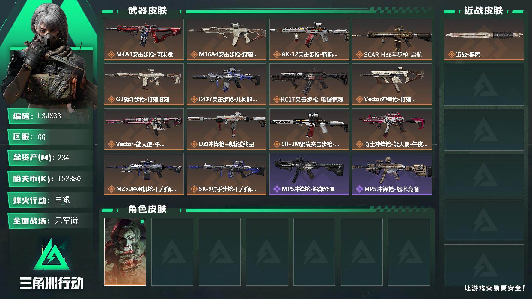 [16143410]【特价出售/店主推荐】234m总资产-152880k哈伏币-60烽火等级-白银-1战场等级-无军衔 【干员外观】:红狼-电锯惊魂 【近战皮肤】:近战-黑鹰 【传说外观】:M4A1突击步枪-阿米娅,M16A4突击步枪-狩猎时刻,AK-12突击步枪-特斯拉线圈,SCAR-H战斗步枪-启航,G3战斗步枪-狩猎时刻,K437突击步枪-几何解构,KC17突击步枪-电锯惊魂,Vector冲锋枪-狩猎时刻,Vector冲锋枪-能天使-午夜邮差,UZI冲锋枪-特斯拉线圈,SR-3M紧凑突击步枪-特斯拉线圈,勇士冲锋枪-能天使-午夜邮差,M250通用机枪-几何解构,SR-9射手步枪-几何解构 【史诗外观】:MP5冲锋枪-深海恐惧,MP5冲锋枪-战术竞备,Vector冲锋枪-阿萨拉文明,SR-3M紧凑突击步枪-战术竞备,SV-98狙击步枪-林中猎手,M700狙击步枪-竞技风 【稀有外观】:M7战斗步枪-捣蛋鬼,SCAR-H战斗步枪-荣耀列队,腾龙突击步枪-冰天雪地,MP5冲锋枪-弄臣,MP5冲锋枪-虎啸,P90冲锋枪-黄昏,P90冲锋枪-捣蛋鬼,UZI冲锋枪-亚特兰蒂斯,SMG-45-行动开启,SMG-45冲锋枪-幻影结构,SMG-45冲锋枪-天网,勇士冲锋枪-冰天雪地,M1014霰弹枪-幻影结构,QJB201轻机枪-哈夫克卫队,Mini-14射手步枪-荣耀列队,SR-25射手步枪-开拓,SV-98狙击步枪-星链科技,SV-98狙击步枪-哈夫克航天,SV-98狙击步枪-精英联盟,G18-星链科技,G18-哈夫克航天 【普通外观】:M4A1突击步枪-猛兽,M4A1突击步枪-粉色涂装,M4A1突击步枪-高雅黑,M4A1突击步枪-海色,QBZ95-1突击步枪-高雅黑,QBZ95-1突击步枪-海浪,QBZ95-1突击步枪-海色,QBZ191突击步枪-三角洲力量,K416突击步枪-高雅黑,M16A4突击步枪-山林猎人,M7战斗步枪-红色涂装,SG552突击步枪-海浪,SCAR-H战斗步枪-数码迷彩,G3战斗步枪-高雅黑,PTR-32突击步枪-黄蜂,MP5冲锋枪-海色,MP5冲锋枪-黄蜂,Vector冲锋枪-几何迷彩,UZI冲锋枪-海色,M1014霰弹枪-高雅黑,M1014霰弹枪-海浪,PKM通用机枪-彩墨喷涂,M249轻机枪-黄蜂,M250通用机枪-条纹,SVD狙击步枪-高雅黑,SR-25射手
