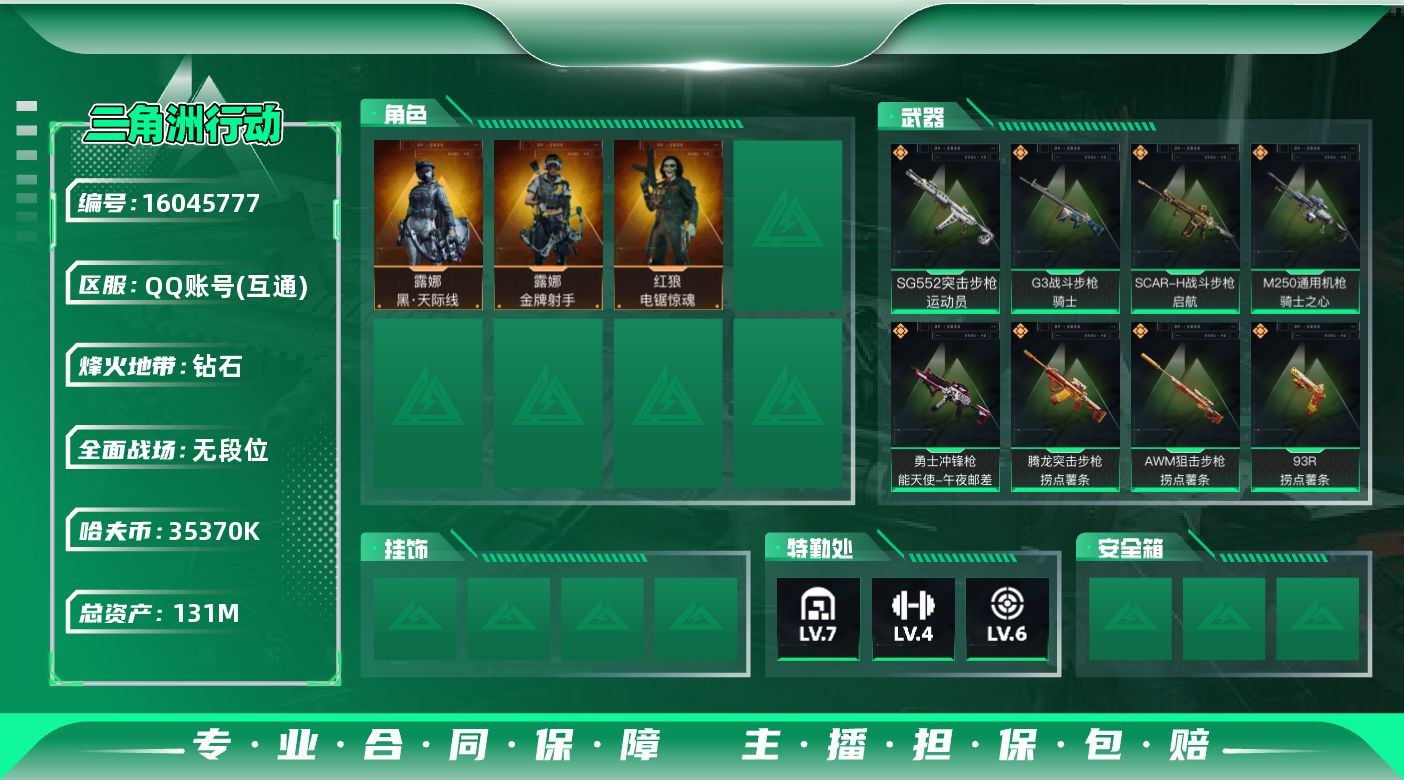 [16045777]【特价出售/店主推荐】131m总资产-35370k哈伏币-60烽火等级-钻石-5战场等级-无军衔 【干员外观】:露娜-黑·天际线,红狼-电锯惊魂,露娜-金牌射手 【近战皮肤】:近战-黑鹰 【传说外观】:M4A1突击步枪-阿米娅,SG552突击步枪-运动员,SCAR-H战斗步枪-启航,G3战斗步枪-骑士,CAR-15突击步枪-阿米娅,腾龙突击步枪-捞点薯条,勇士冲锋枪-能天使-午夜邮差,M250通用机枪-骑士之心,AWM狙击步枪-捞点薯条,93R-捞点薯条,复合弓-黑·天际线 【史诗外观】:ASh-12战斗步枪-无极限,AUG突击步枪-蝮蛇,M7战斗步枪-百步穿杨,G3战斗步枪-流沙送葬,AS Val突击步枪-百步穿杨,腾龙突击步枪-猎鳄行动,K437突击步枪-守护者,MP5冲锋枪-战术竞备,MP5冲锋枪-竞技风,P90冲锋枪-莫斯提马,Vector冲锋枪-百步穿杨,Vector冲锋枪-异域战争,SR-3M紧凑突击步枪-战术竞备,勇士冲锋枪-工业狂潮,MP7冲锋枪-守护者,Mini-14射手步枪-守护者,SVD狙击步枪-阿萨拉工艺,SV-98狙击步枪-林中猎手,SV-98狙击步枪-囚徒,M700狙击步枪-蝮蛇,M700狙击步枪-百步穿杨,AWM狙击步枪-无极限,AWM狙击步枪-流沙送葬,沙漠之鹰-曙光,复合弓-守护者 【稀有外观】:M4A1突击步枪-繁盛,AKM突击步枪-战术演练,AKM突击步枪-肃杀,QBZ95-1突击步枪-公平竞技,ASh-12战斗步枪-繁盛,M7战斗步枪-捣蛋鬼,SCAR-H战斗步枪-荣耀列队,SCAR-H战斗步枪-黄昏,G3战斗步枪-战术演练,G3战斗步枪-主宰,MP5冲锋枪-弄臣,MP5冲锋枪-哈夫克卫队,P90冲锋枪-黄昏,P90冲锋枪-捣蛋鬼,Vector冲锋枪-先锋,UZI冲锋枪-亚特兰蒂斯,野牛冲锋枪-前沿科技,SMG-45-行动开启,SMG-45冲锋枪-幻影结构,SMG-45冲锋枪-天网,勇士冲锋枪-主宰,勇士冲锋枪-冰天雪地,MP7冲锋枪-钢铁之躯,M1014霰弹枪-幻影结构,S12K霰弹枪-战术演练,QJB201轻机枪-黄昏,QJB201轻机枪-哈夫克卫队,Mini-14射手步枪-荣耀列队,SKS射手步枪-弄臣,SR-25射手步枪-开拓,SR-9射手步枪-街头涂鸦,PSG-1射手步枪-主宰,G18-星链科技,G18-哈夫克航天