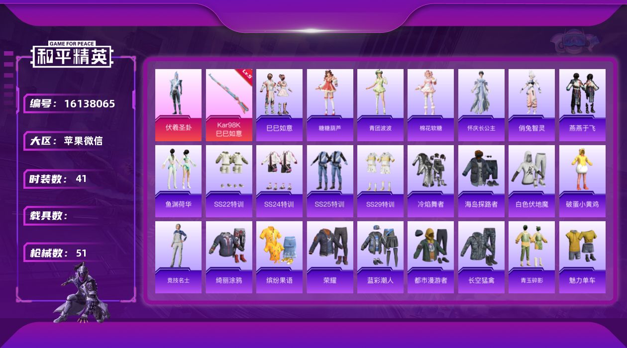 [16138065]【特价出售/店主推荐】 苹果 微信-1粉装-1特效枪-0载具-0粉色飞行器-15640热力值-5王牌印记-41套装-51枪皮 【粉色套装】:角色-伏羲圣卦 【粉色枪皮等级】:Kar98K-巳巳如意(五级) 【粉色枪皮】:Kar98K-巳巳如意 【粉色降落伞】:月影灵韵降落伞,冷漠罗丽降落伞 【稀有套装】:套装-巳巳如意,套装-糖糖葫芦,套装-青团波波,套装-棉花软糖,角色-怀庆长公主,角色-俏兔智灵,套装-燕燕于飞,套装-鱼渊荷华 【稀有枪皮】:AKM-破晓战魂,AKM-玄冥寒域,SCAR-L-炫彩节奏,SCAR-L-红色方程式,M416-红色方程式,M416-绯红前夜,GROZA-懵萌河马,AUG-甜蜜菠萝,AUG-耀粉歌者,QBZ-未来歌姬,G36C-懵萌河马,UMP45-蓝色火焰,AKS-74U-鬼刀,P90-巳巳如意,Mini14-涂山之恋,莫辛纳甘-懵萌河马,M417-惊鸿侠骨,S686-彩虹符号,S686-巳巳如意,MG3-幻世战舞者,MG3-惊鸿侠骨,PKM-懵萌河马,破片手榴弹-巳巳如意 【其他套装】:套装-SS22特训,套装-SS24特训,套装-SS25特训,套装-SS29特训,套装-冷焰舞者,套装-海岛探路者,套装-白色伏地魔,套装-破蛋小黄鸡,套装-竞技名士,套装-绮丽涂鸦,套装-缤纷果语,套装-荣耀,套装-蓝彩潮人,套装-都市漫游者,套装-长空猛禽,套装-青玉碎影,套装-魅力单车,套装-黑色伏地魔,套装-懵萌河马,套装-神气柴柴,套装-甜梦熊熊,套装-锦衣飞扬 【营地ID】:948752819