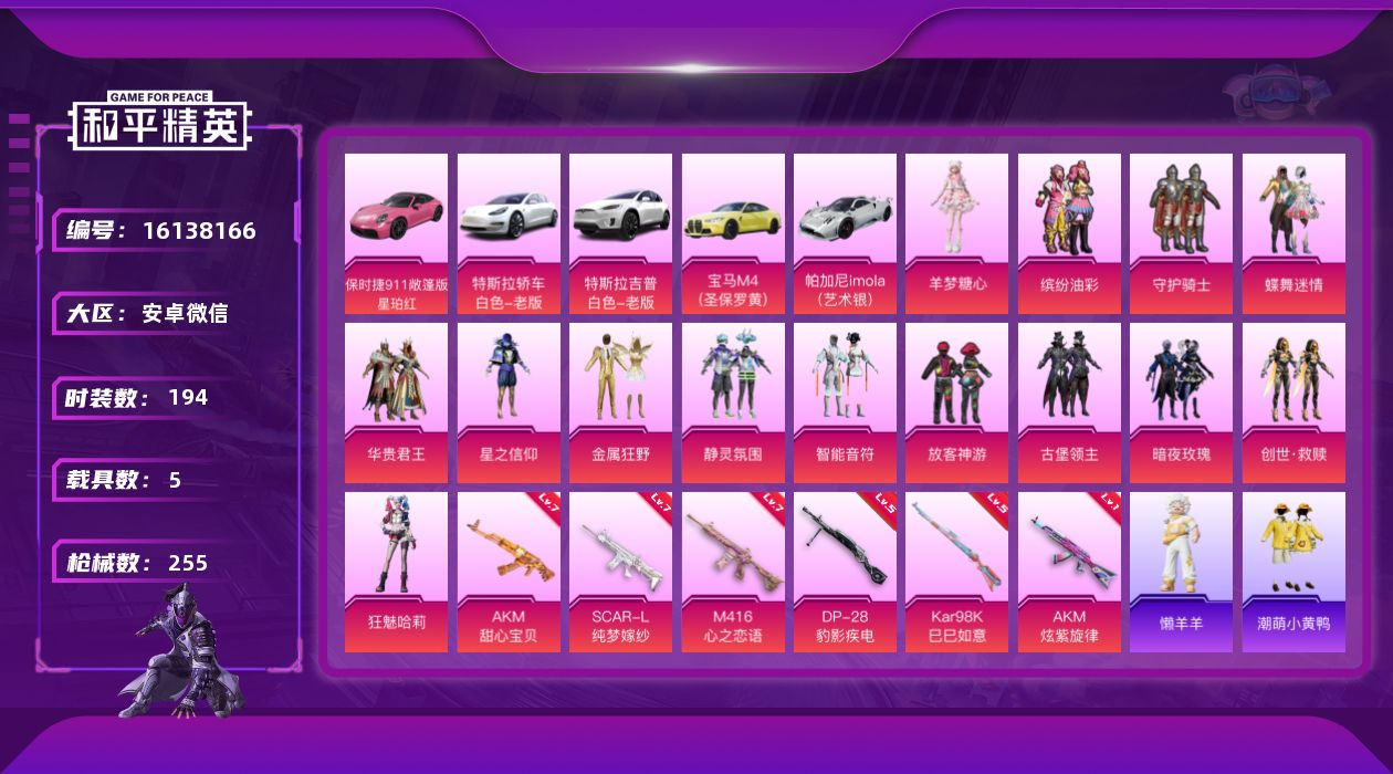 [16138166]【特价出售/店主推荐】安卓 微信-14粉装-6特效枪-5载具-5粉色飞行器-9.2w热力值-12王牌印记-194套装-255枪皮 【热门品类】:粉装-缤纷油彩,套装-龟仙人,套装-潮萌小黄鸭 【粉色套装】:粉装-守护骑士,粉装-蝶舞迷情,粉装-华贵君王,粉装-星之信仰,粉装-金属狂野,粉装-静灵氛围,粉装-智能音符,粉装-缤纷油彩,粉装-放客神游,粉装-古堡领主,粉装-暗夜玫瑰,套装-创世·救赎,角色-狂魅哈莉,角色-羊梦糖心 【粉色枪皮等级】:AKM-甜心宝贝(七级),AKM-炫紫旋律(一级),SCAR-L-纯梦嫁纱(七级),M416-心之恋语(七级),Kar98K-巳巳如意(五级),DP-28-豹影疾电(五级) 【粉色载具】:特斯拉Model 3(珍珠白),特斯拉Model X(珍珠白),宝马M4(圣保罗黄),帕加尼imola(艺术银),保时捷911 敞篷版(星珀红) 【粉色枪皮】:AKM-甜心宝贝,AKM-炫紫旋律,SCAR-L-纯梦嫁纱,M416-心之恋语,Kar98K-巳巳如意,DP-28-豹影疾电 【粉色飞行器】:炫紫旋律飞行器,古堡领主飞行器 【粉色降落伞】:绝对恒星降落伞,凝视深渊降落伞,雪国幻梦降落伞,春暖花开降落伞,精灵迷巫降落伞,天启纪元降落伞,星之信仰降落伞,炫紫旋律降落伞,古堡领主降落伞,繁花小夜曲降落伞,葫芦兄弟降落伞,筑梦精灵降落伞,圣堂之誓降落伞,精灵梦叶罗丽降落伞,创世·救赎降落伞,星穹咏叹调降落伞,双重狂想降落伞,炫彩糖果降落伞 【稀有套装】:套装-龟仙人,套装-巳巳如意,套装-糖糖葫芦,套装-青团波波,角色-摩登魅猫,套装-燕燕于飞,套装-鱼渊荷华,套装-星渊小夜曲,套装-混沌火种,玩偶服-懒羊羊,套装-炫彩糖果 【稀有枪皮】:AKM-星之信仰,AKM-春暖花开,AKM-玉龙,AKM-缤纷海域,AKM-霓虹街区,AKM-龙的传人,M16A4-九霄,M16A4-凝视深渊,M16A4-幻世战舞者,M16A4-机械英豪,M16A4-甜心亚梦,M16A4-红色方程式,M16A4-魔法学院,SCAR-L-凝视深渊,SCAR-L-炫彩节奏,SCAR-L-生命誓言,SCAR-L-繁花小夜曲,SCAR-L-雷霆特警,M416-仓鼠灰灰,M416-红色方程式,M416-罗小黑,M416-蓝色火焰,M416-魔法学院,GROZA-恐龙拽拽,GRO